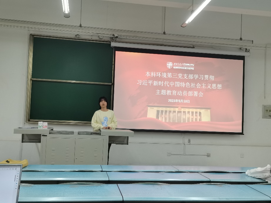 2023年5月10日晚1900,本科环境第党支部X2213开展了“学习贯彻习近平新时代中国特色社会主义思想”主题教育动员部署会,会议主题是传达校、院党委关于主题教育部署的相关精神和结合支部情况规划日后主题教育时间安排。本次大会由支部书记钟若兰同志主持,本科环境第党支部全体党员参与。
