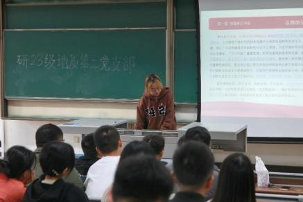 2023 年 10 月 18 日,研 2023 级地质第二党支部于九里校区四号教学楼 J4509 开展了以 “学习二十大,争做新青年 ”为主题的党日活动。本次活动由党支部书记黄丽敏主持,共到党员 9 名, 支部成员共计 21 人与会。