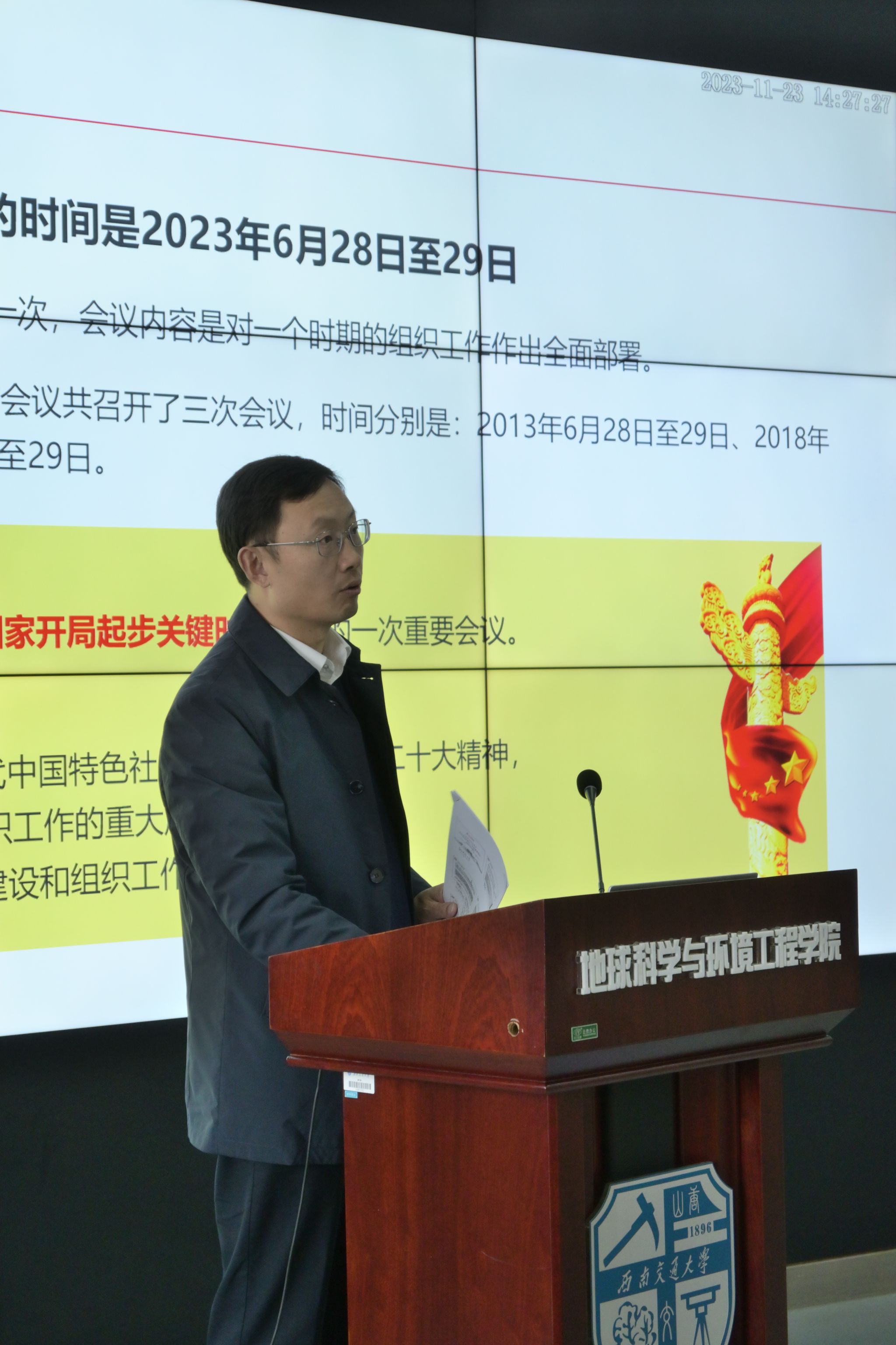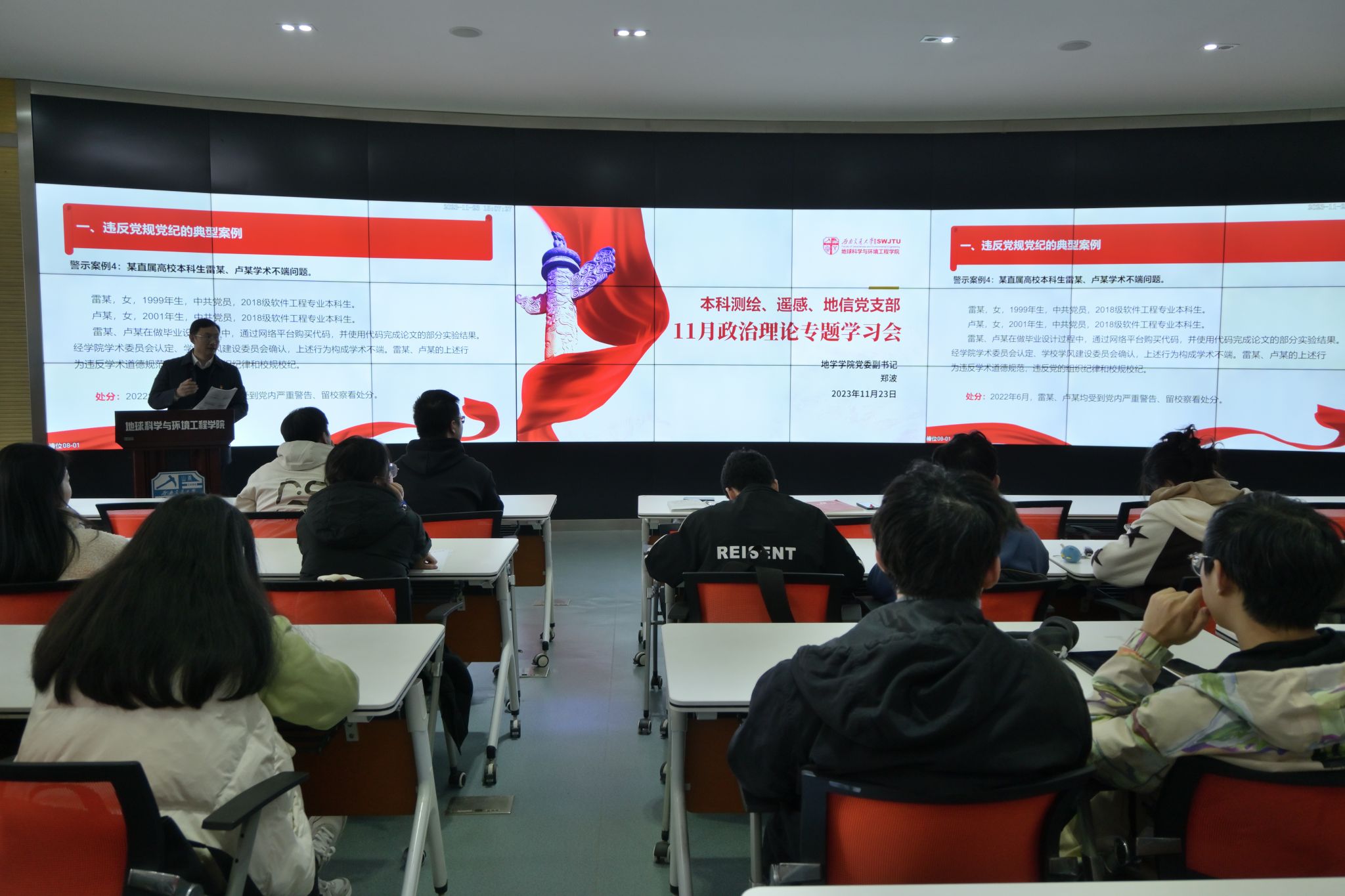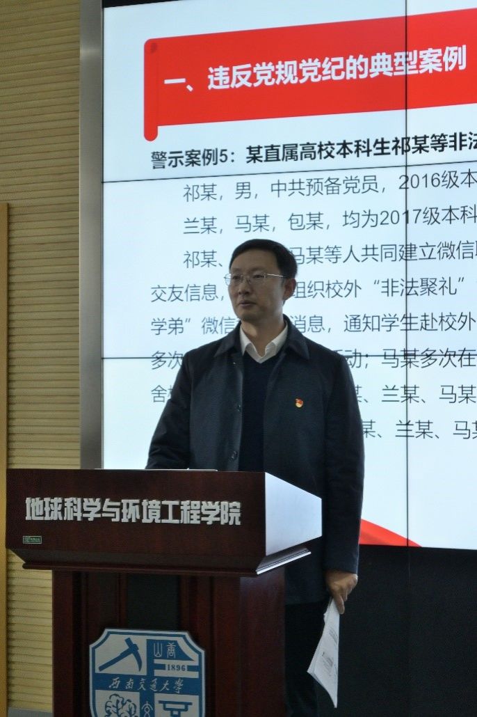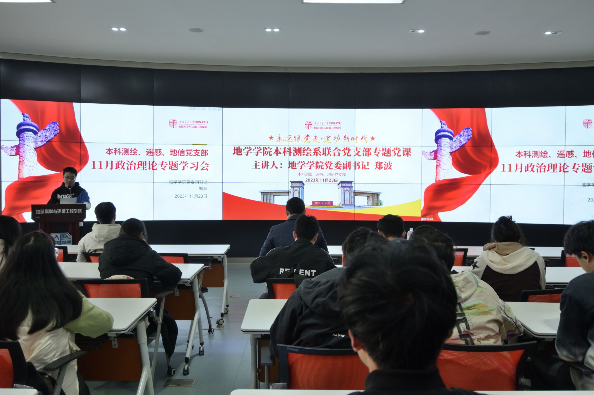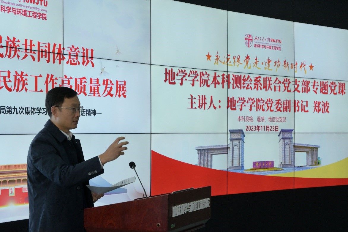 地球科学与环境工程学院本科测绘、地信、遥感党支部于2023年11月23日14:00在犀浦校区X4243联合开展了“永远跟党走·建功新时代”主题党日活动,活动分为十一月政治理论学习和专题党课,政治理论学习由本科测绘党支部书记任纪州同志领学,专题党课由学院党委副书记郑波主讲,本科测绘、地信、遥感党支部部分党员同志、2023-02期发展对象参与。