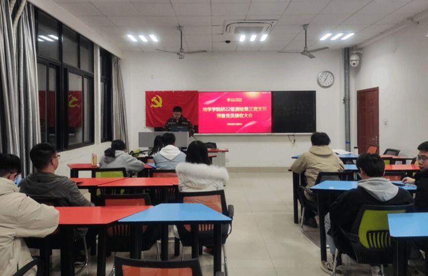 研22级测绘第三党支部在X4131教室顺利召开预备党员接收大会,本次会议的主题:讨论是否接收陈星宇同志为预备党员。会议由党支部组织委员杨成明同志主持,支部所有党员均参与。