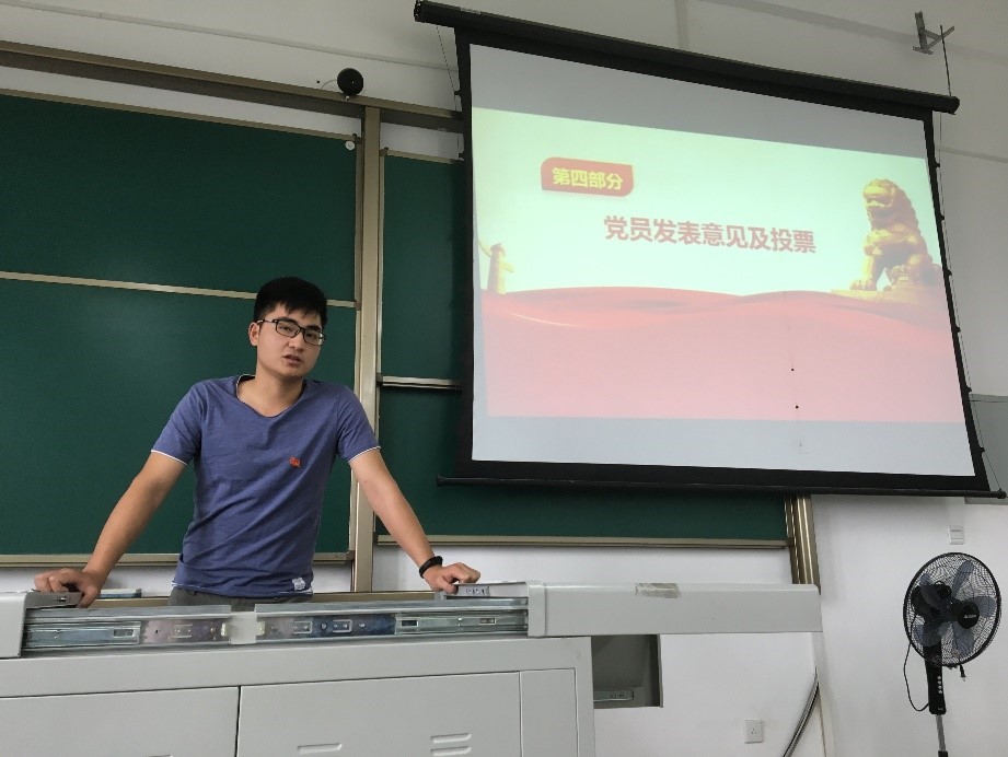 会议第一项由入党积极分子孙靖杰同志汇报个人在考察期内思想、政治、生活、学习等方面取得的进步和不足,介绍个人基本情况以及对党章党性相关知识的理解,同时对自己的入党动机进行了详细的阐述。