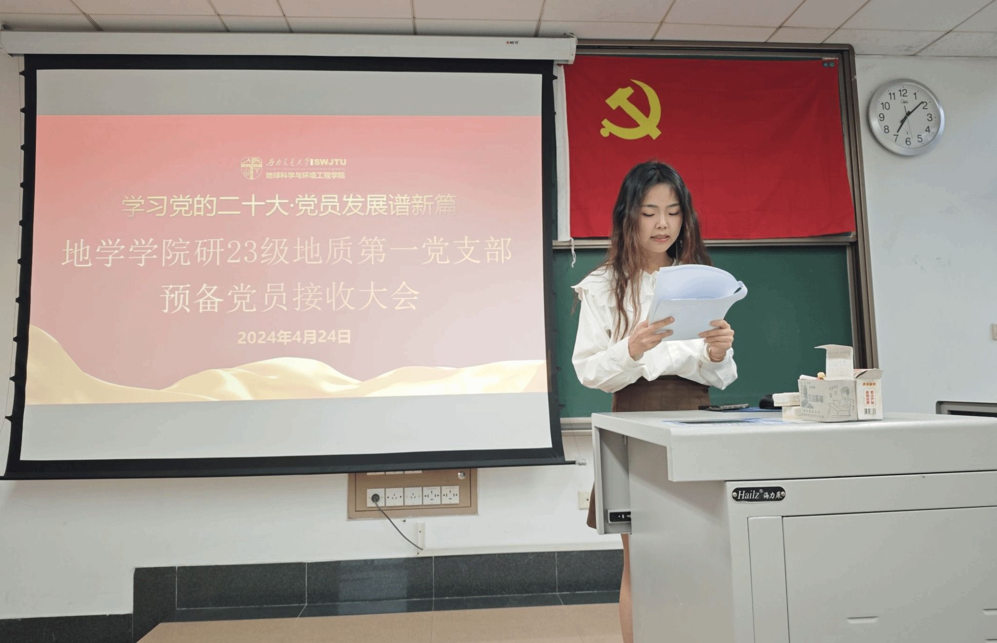 为做好2024年发展党员工作,切实提高党员发展质量。研23级地质第一党支部于2024年4月24日19:00在J4221召开2024-01期预备党员接收大会,本次会议由党支部书记张雨晴同志主持,支部党员、发展对象、入党积极分子和入党申请人总计17人与会。
