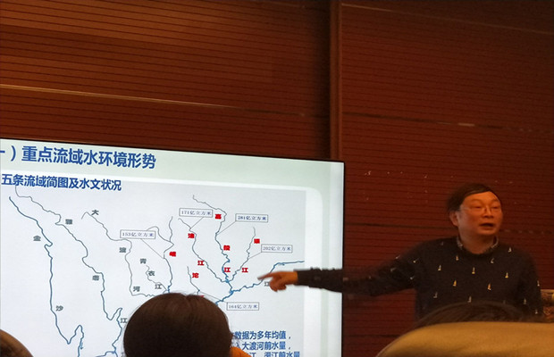 在谈到对重点流域水环境形势时,欧阳峰针对沱江、岷江、涪江、渠江、嘉陵江五大水系的水环境现状,详细地讲授了当下水污染的严重形势。同时向在场博士生讲授水污染防治攻坚的战略重点总体目标,并结合十九大报告从“坚持铁腕治污,加快机制创新,突破投资困境,注重科技引领”四个方面讲述了当下水污染防治攻坚重点工作。