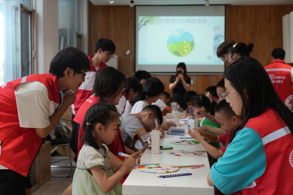 在手工制作环节中,全体人员耐心地指导孩子们在宣纸扇上进行节气绘画。每个孩子都分到了一把宣纸扇和绘画工具,可以根据自己喜欢的节气进行创作。志愿者们用简单的语言和示范,向孩子们讲解了如何在扇面上构图、上色,以及如何在绘画中表现出节气的特色。