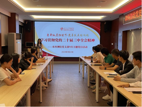 党的二十届三中全会与2024年7月15日至18日在北京举行,党的二十届三中全会通过的《中共中央关于进一步全面深化改革、推进中国式现代化的决定》提出进一步全面深化改革的指导思想,“习近平总书记关于全面深化改革的一系列新思想、新观点、新论断”是其中最重要的内容。为推动支部内同志学习贯彻党的二十届三中全会精神,本科测绘党支部于2024年9月22日在犀浦校区X4520举办9月份党日活动,胡嘉祎同志主持本次会议,陈荩娜老师出席并指导本次会议。