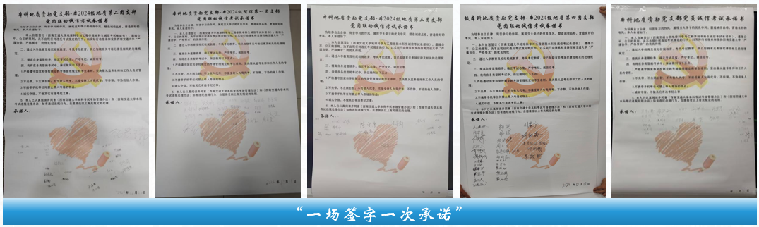 为深化党团共建,党支部积极发挥战斗堡垒作用,主动对接2024级地质资勘专业新生团支部,构建起一对一帮扶小组,架起经验传承与智慧共享的桥梁。支部中的优秀党员代表,与新生团支部成员深入交流,分享学习心得与备考策略,强调考试纪律规定,共同签订考试诚信承诺书。以党带团、以老带新,党支部积极引领学风建设,党团携手共同营造了积极向上、诚信守纪的良好学习氛围。