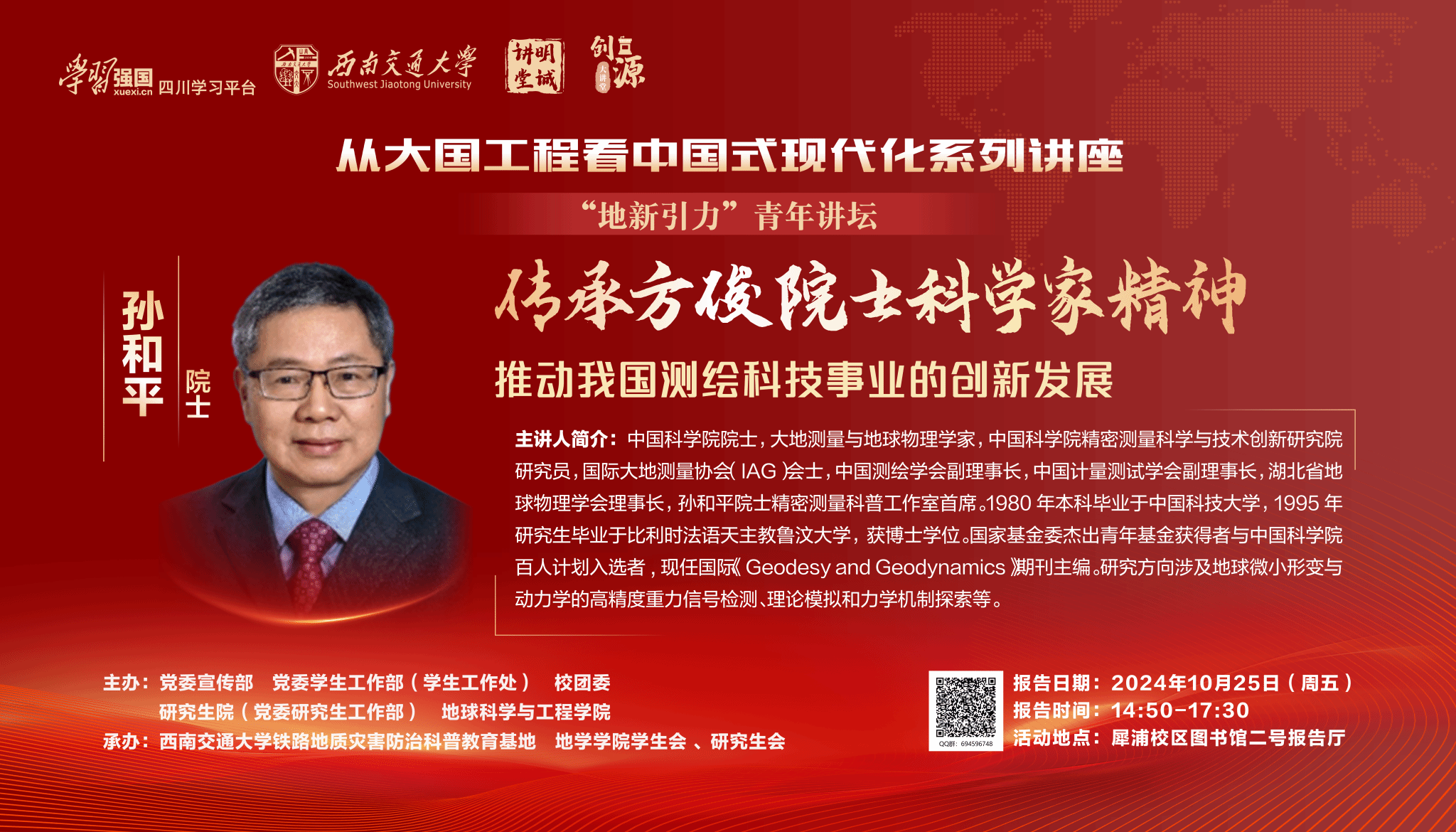 2. 本期 “从大国工程看中国式现代化”讲座是一场弘扬科学家精神的生动思政课。本期讲座图书馆二号报告厅容量为230人,同时活动也设有活动QQ群:(694596748)。