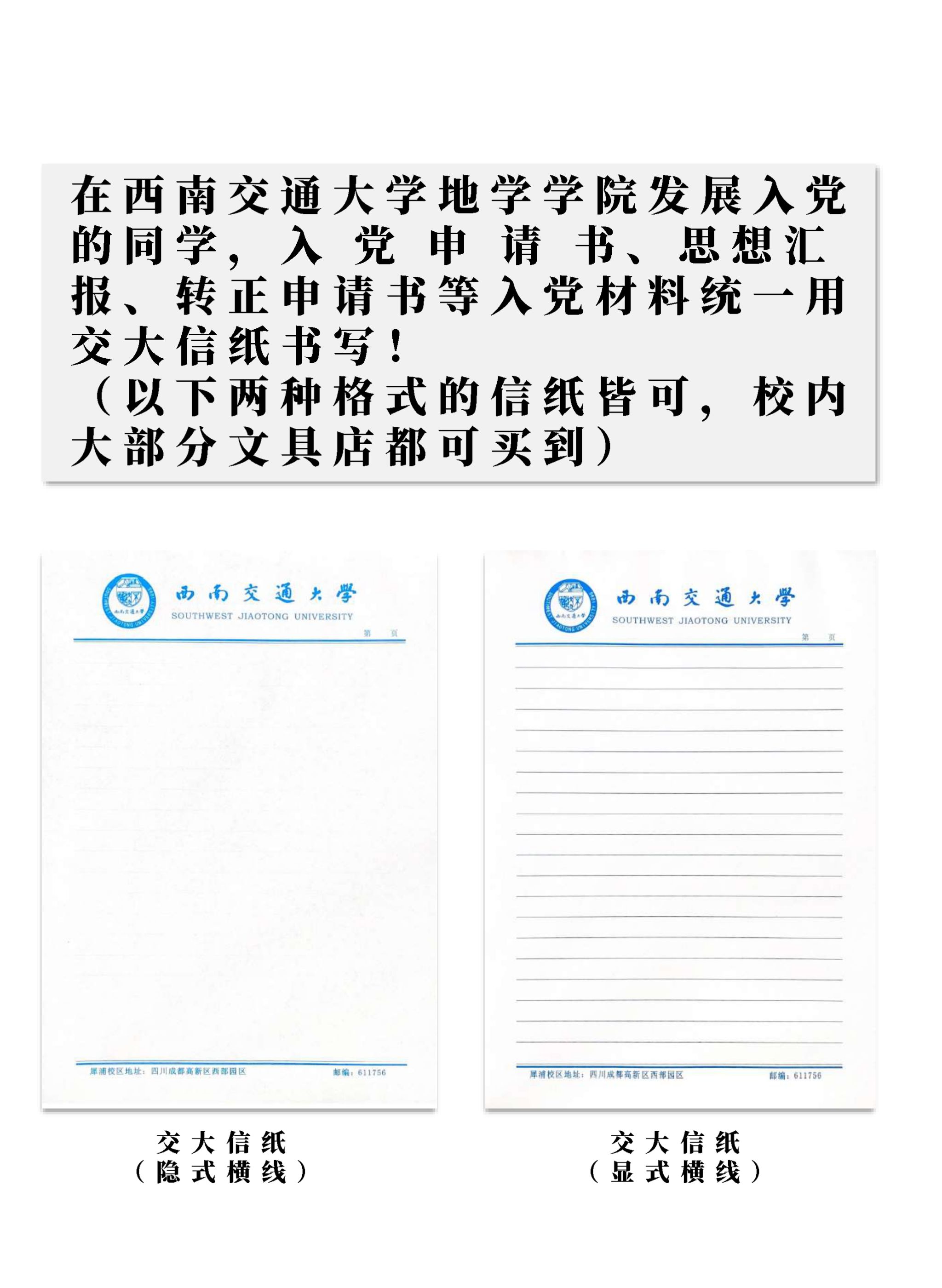发展入党的同学,要求所有入党材料(含入党申请书、思想汇报、转正申请书等)均用交大信笺纸书写并装订。