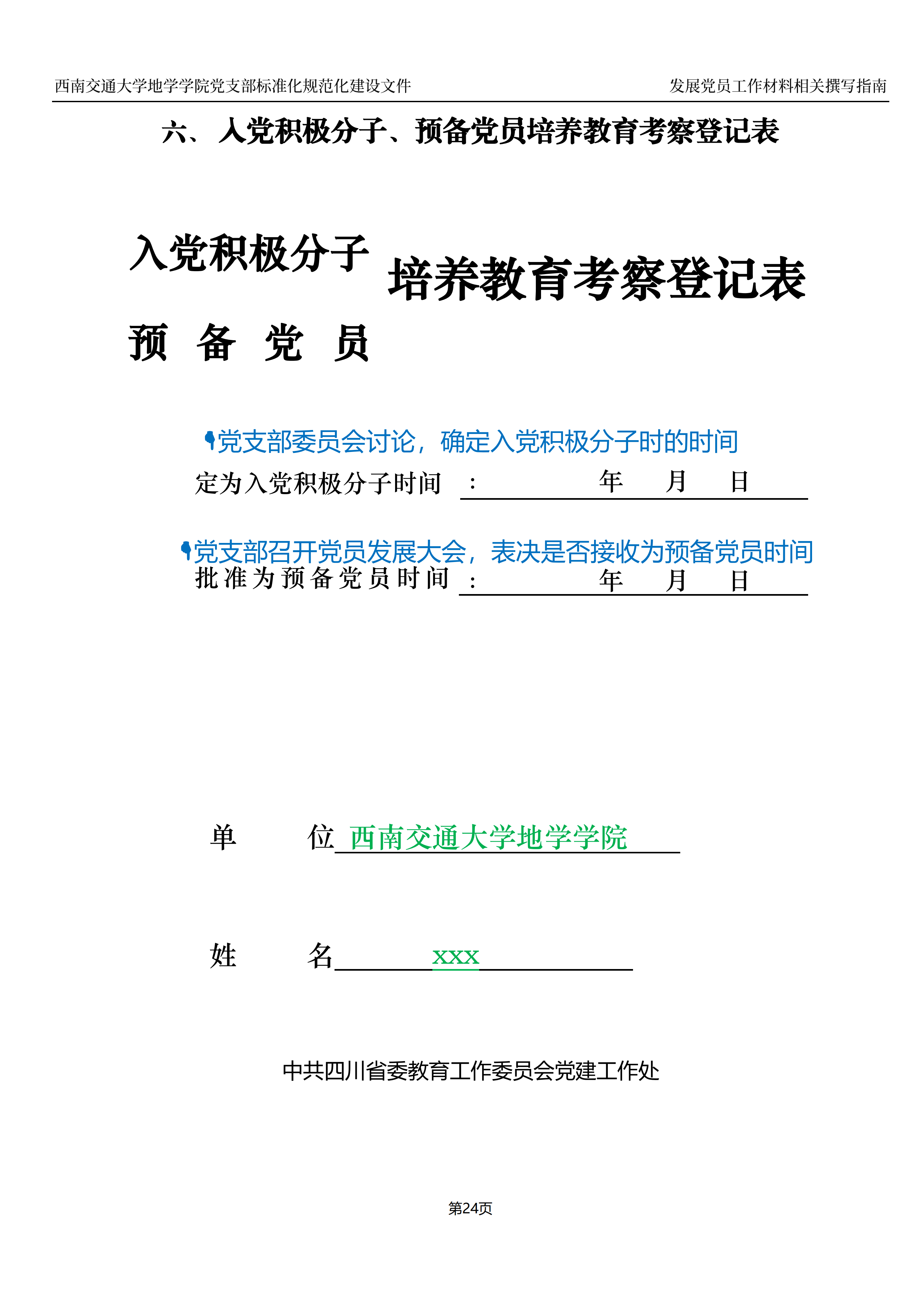 此份文件为2023年9月前使用的旧版文件,2023年9月1日之后确定为入党积极分子或转入学院接续培养的同志请跳转链接参照新版入党积极分子、发展对象、预备党员培养教育考察登记表: