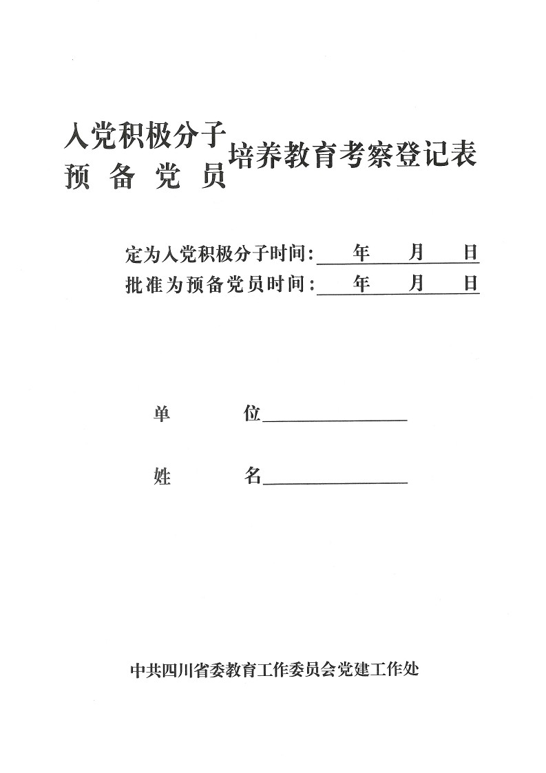 入党积极分子、预备党员培养教育考察登记表封面样例: