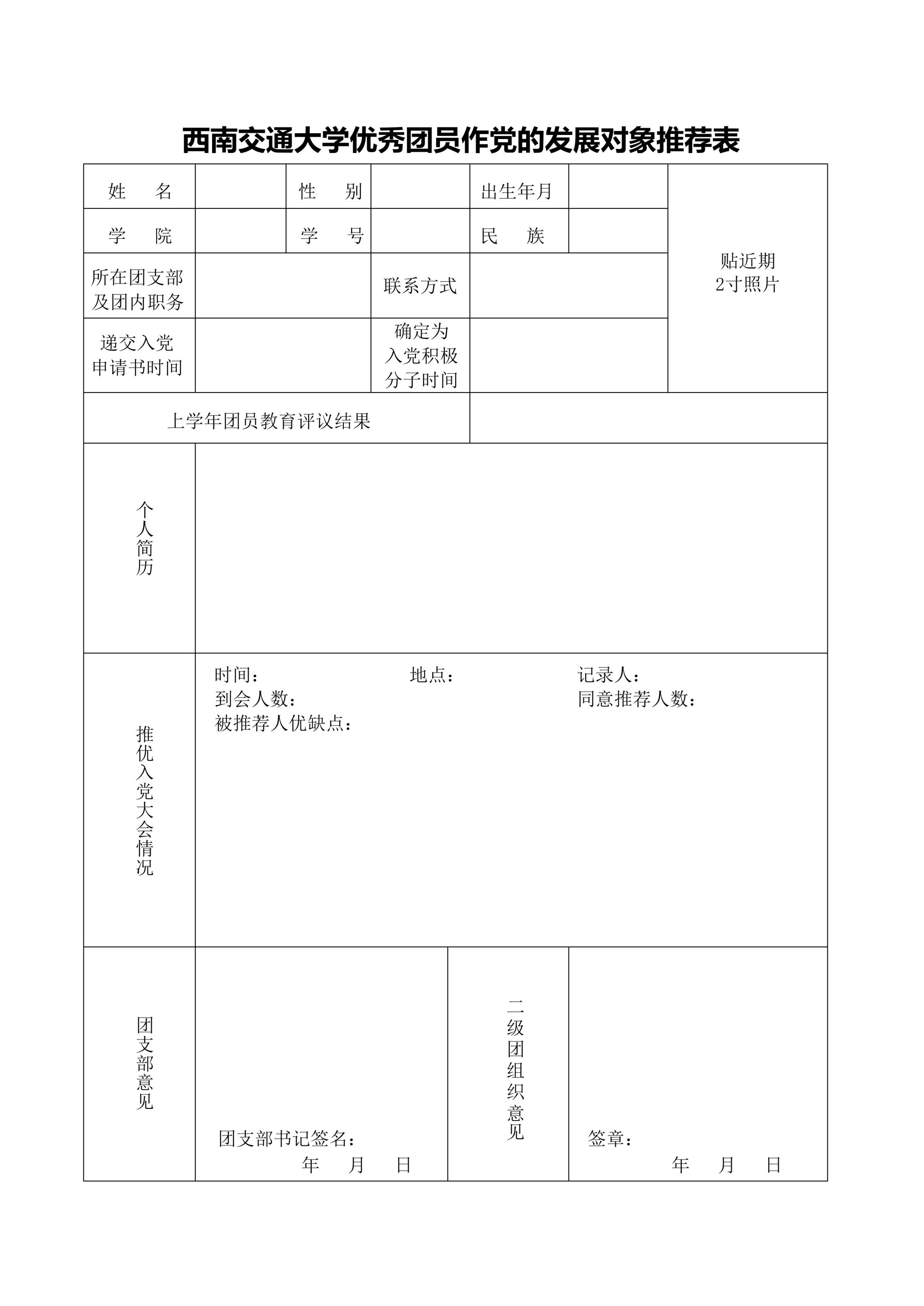 影巢 优秀团员作党的发展对象推荐表样例