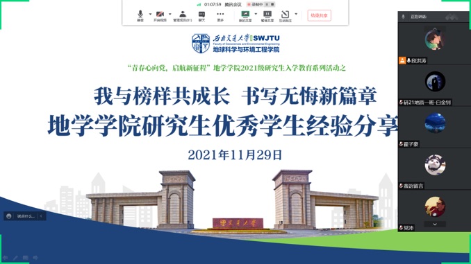 为了进一步加强研究生对专业学术研究的前沿认知,促进学生更好地把握研究方向,同时为了帮助同学们解决困扰,让同学们能够更好的投入到研究生的学习和生活当中,地球科学与环境工程学院于202111291900-2030采用线上腾讯会议方式举办了砥砺研途·优秀学生经验分享会,本次经验分享会特意邀请了三位国家奖学金得主:王番(2019级环境科学与工程专业硕士研究生)、党沛(2019级测绘工程专业硕士研究生)、姚禹(2019级地质工程专业硕士研究生),来为同学们分享他们在学术过程中的心得体会。