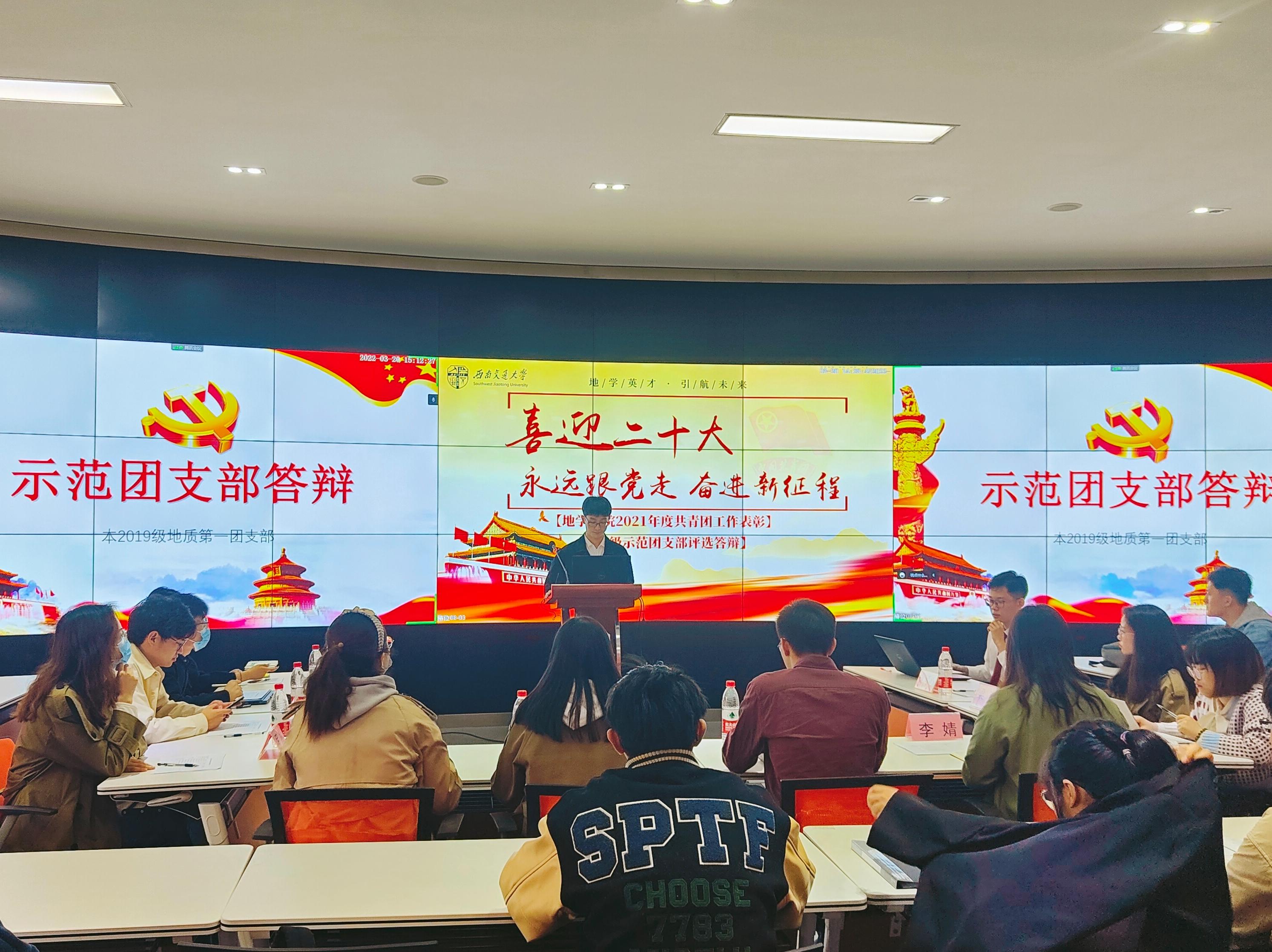 团委于2022年3月20日在犀浦校区X4243教室举行2021年度院级示范团支部答辩会,答辩会采用线上加线下相结合的方式。地球科学与环境工程学院团委书记杨都强,院团委副书记翟琦、李婧、董可,学生园区与事务中心指导老师王琼,学习与科创中心指导老师梁爽,青年志愿者协会指导老师罗然,团建中心指导老师赵瑞涵,学生党建工作老师刘礼钊、史可心出席并担任评委,2018级、2019级和2020级本科生及研究生共10个团支部参与答辩。本次答辩会由李宝贤主持。