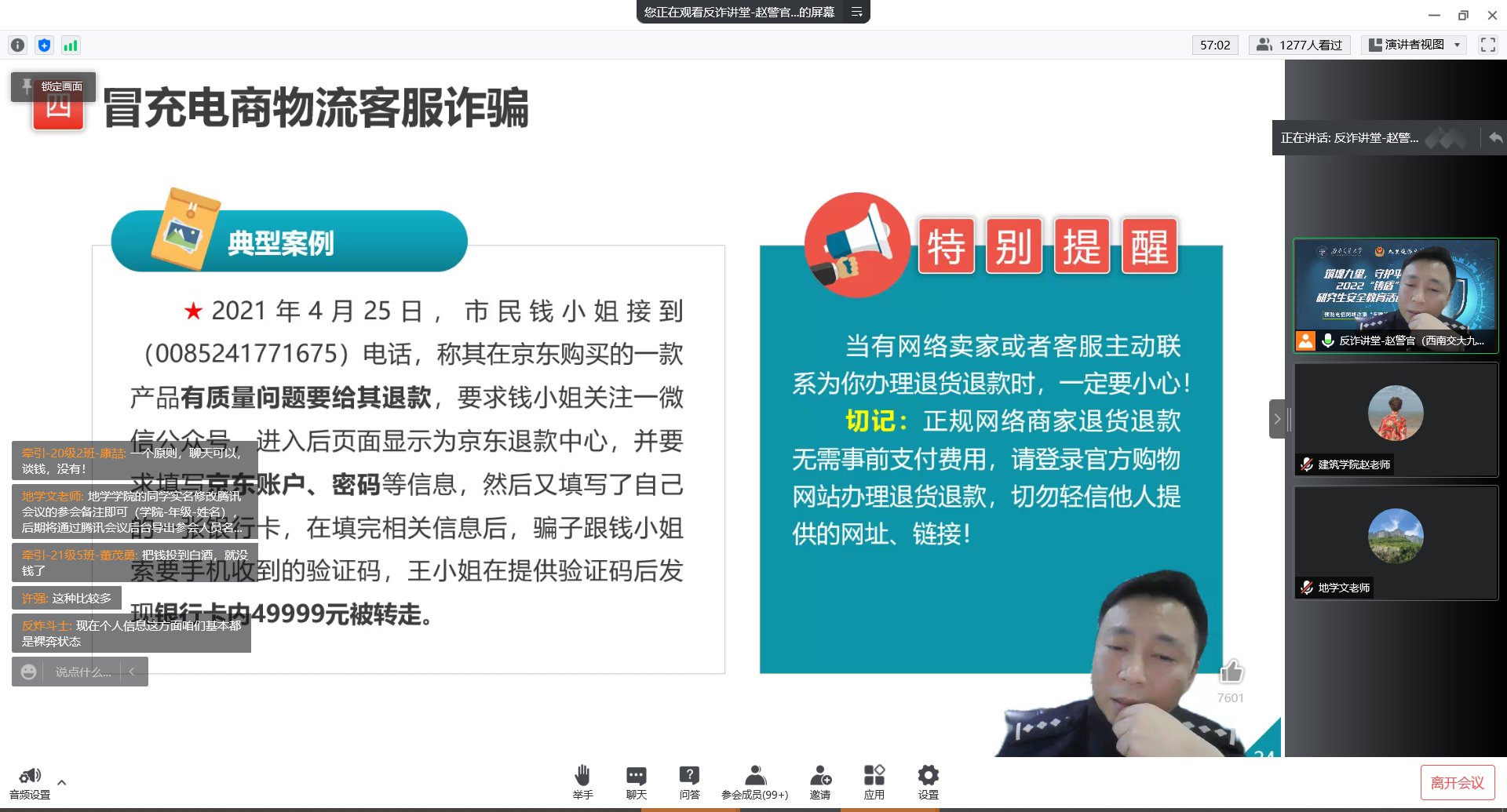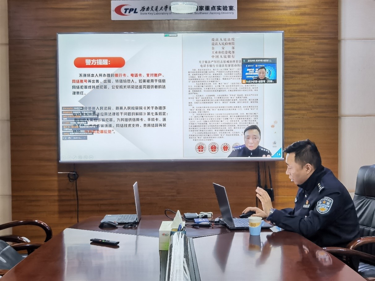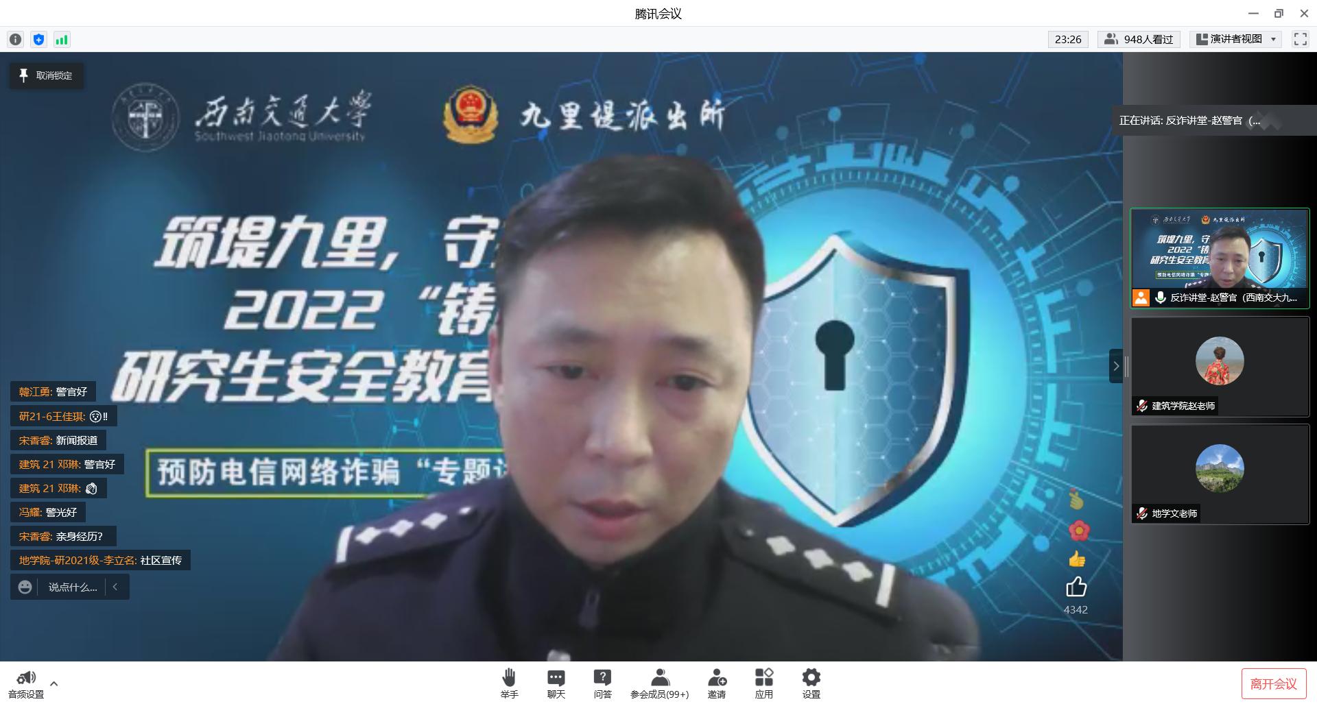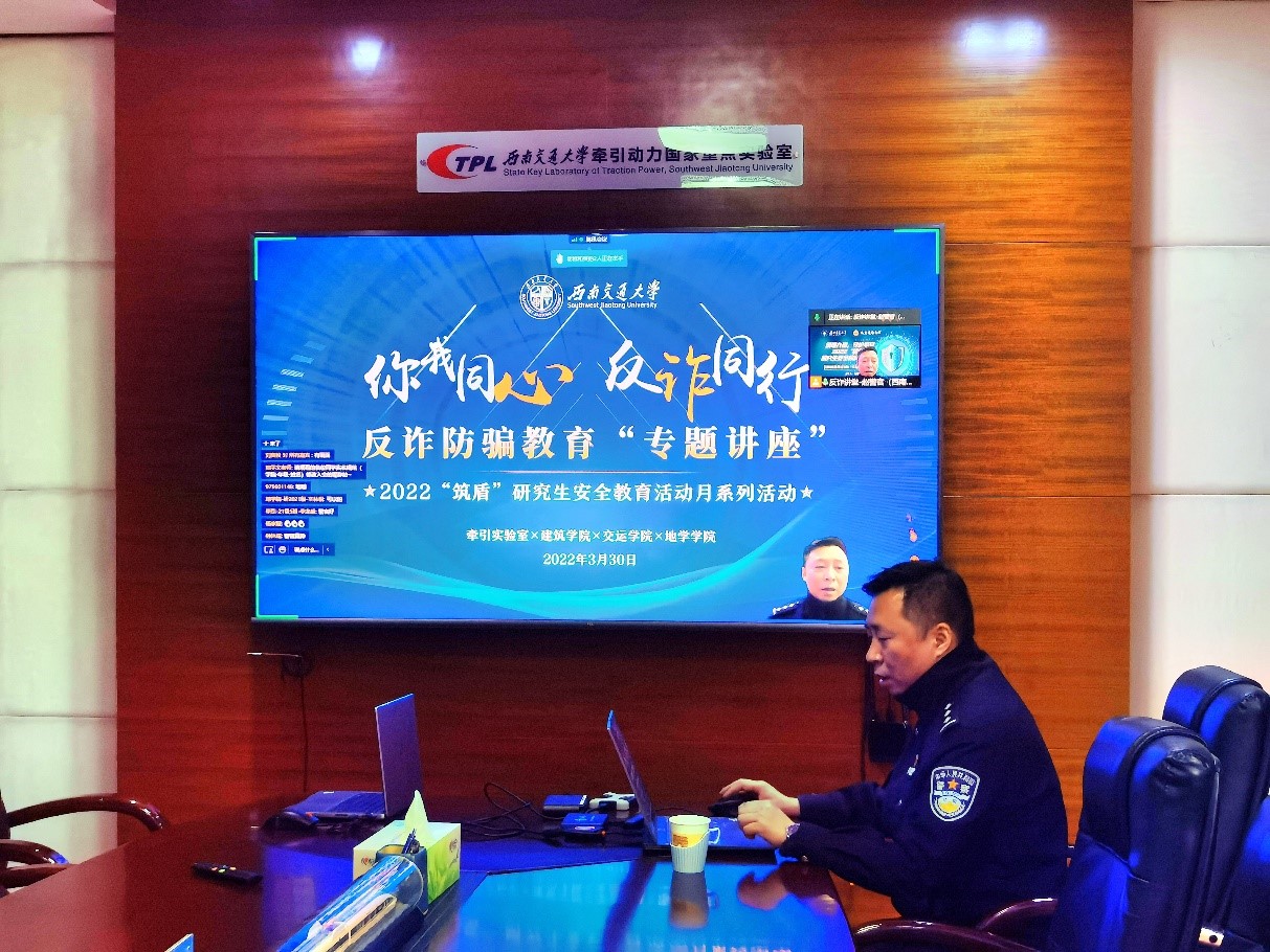 联合牵引动力实验室、建筑学院、交运学院共同举办了“你我同心 反诈同行”——反诈防骗教育“专题讲座”。根据疫情防控需要,本次讲座通过腾讯会议线上召开,特邀九里堤派出所赵磊警官担任主讲人,影巢