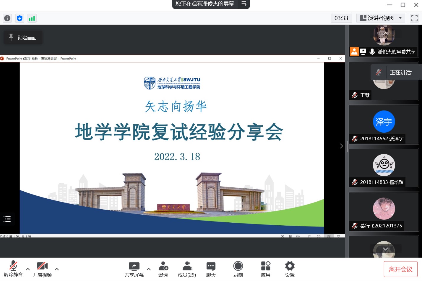 研究生会于2022年3月18日在腾讯会议成功举行了考研复试经验分享会,本次分享会面向2022届预报考我院研究生的同学,旨帮助同学建立复试信心,进而促进我院复试工作的顺利进行,本次复试经验分享会邀请到了2021级测绘、地质、资环三个专业的复试优秀代表,为2022届预报名我院研究生的同学分享他们在考研复试过程中的心得体会。