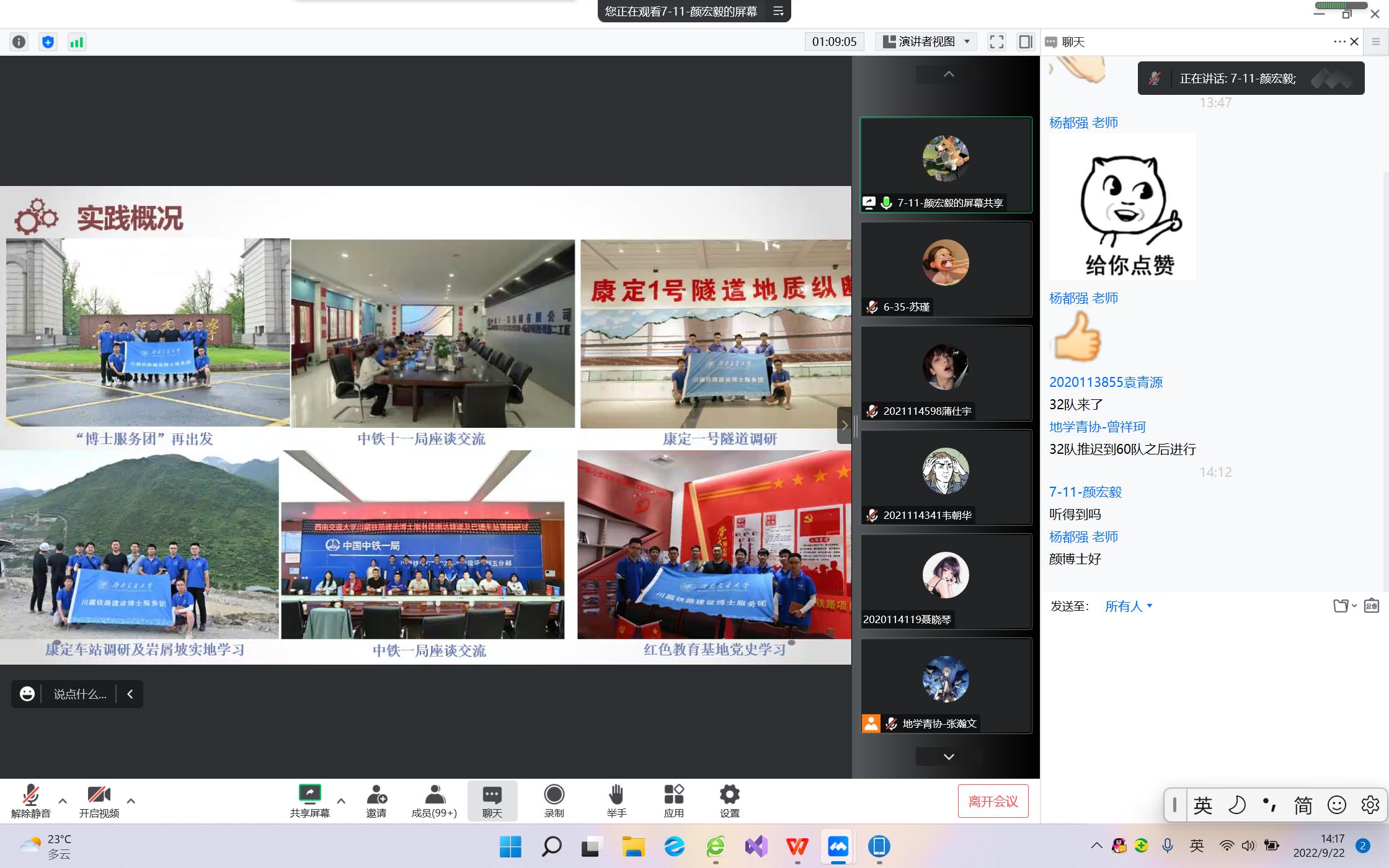 前往川藏铁路的博士服务团代表颜宏毅向大家展示了博士服务团在川藏铁路沿线进行的科研考察与座谈交流并与大家分享了在调研实践后的新得感受。