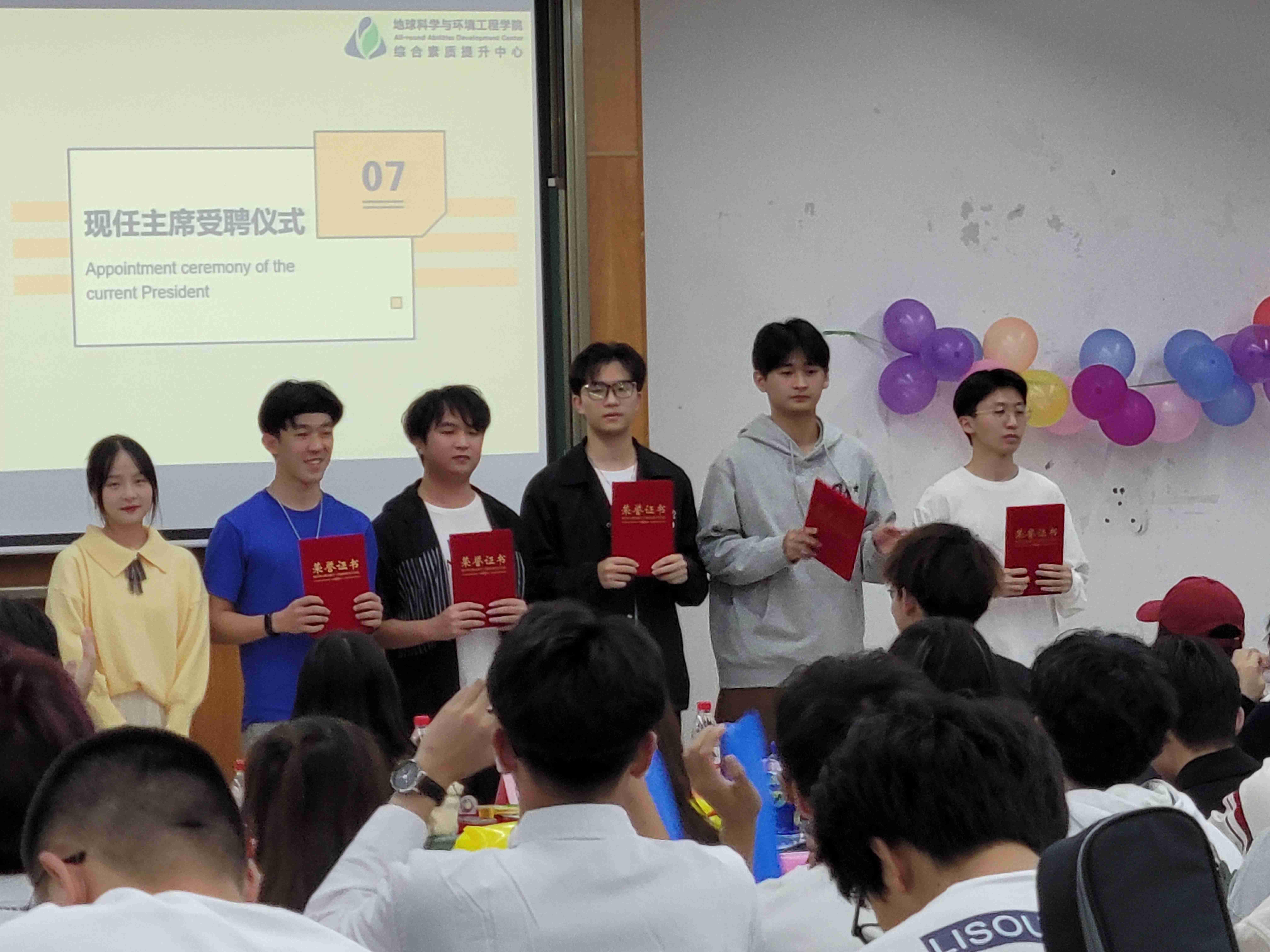 大会进入下一项,新一届的干部进行了庄重的受聘仪式。由陈荩娜老师综合素质中心主席主题团成员颁发了聘书。随后,主席团成员为部长们佩戴了工作证。受聘仪式为新成员树立了良好的榜样形象,激发了大家的斗志,为综合素质提升中心之后工作顺利、安排协调做出了良好的引导。