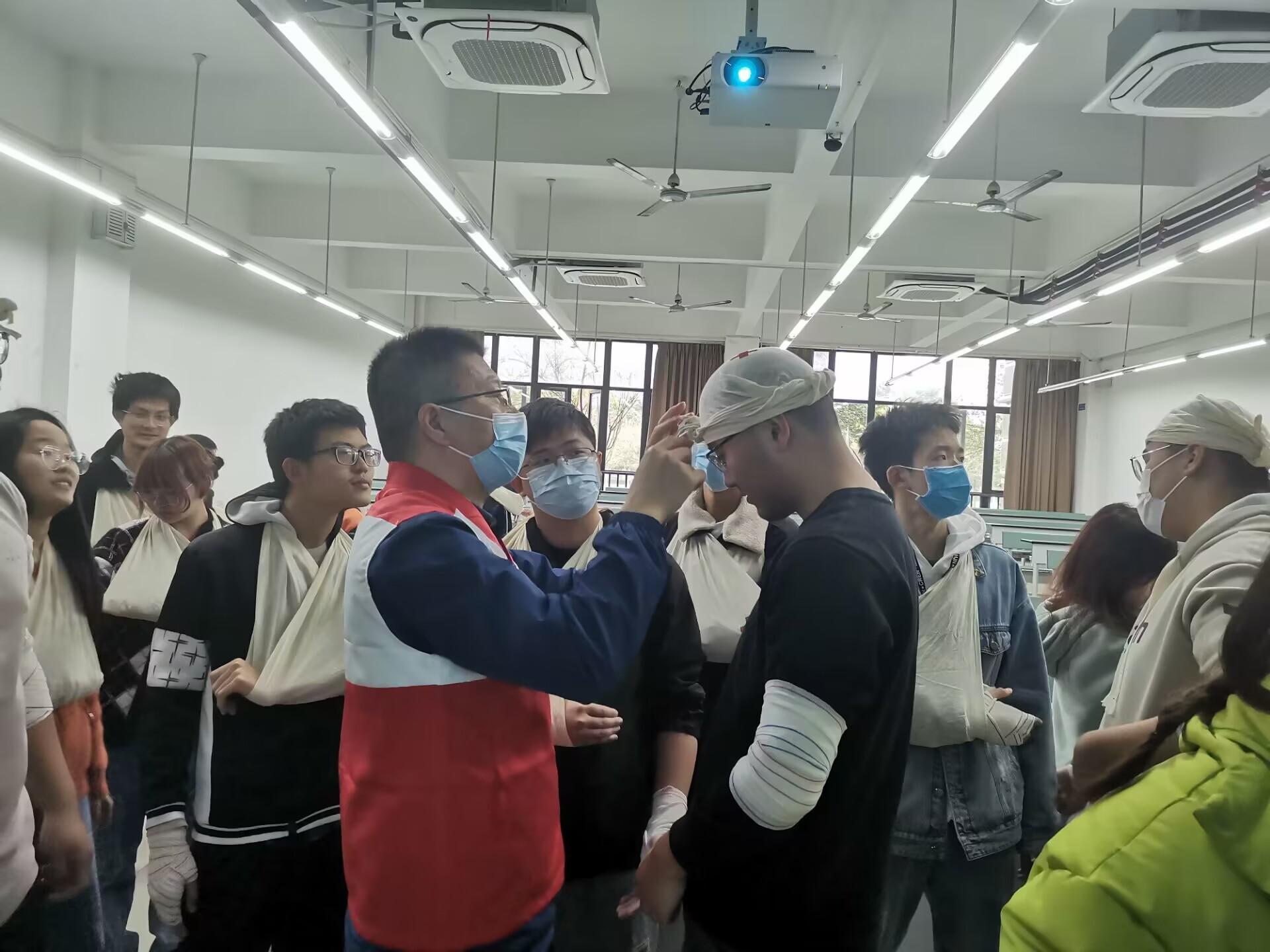 活动分为三个时间安排,早上9点至12点,郫都区红十字会老师给同学们讲解红十字运动基本知识和演示教授创伤包扎的正确方法。在老师的耐心引导下,同学们掌握了红十字会的相关知识,并学习了如何在生活中常见意外创伤事故,如摔伤、交通事故等意外中对创伤进行紧急处理,如何使用绷带、纱布、三角巾等医疗用品对伤口进行简单的止血、处理和包扎,并借助教具进行了实操练习。