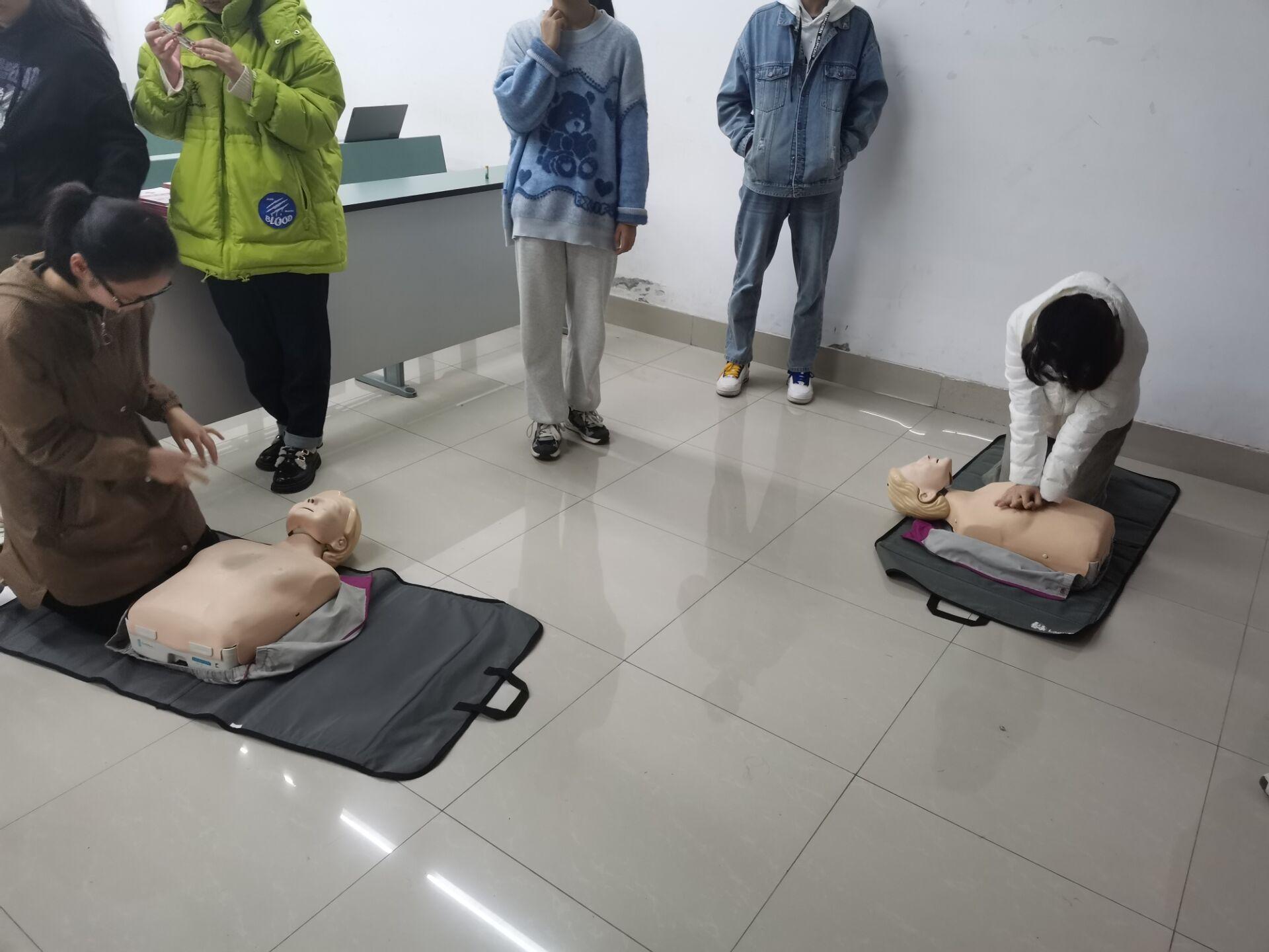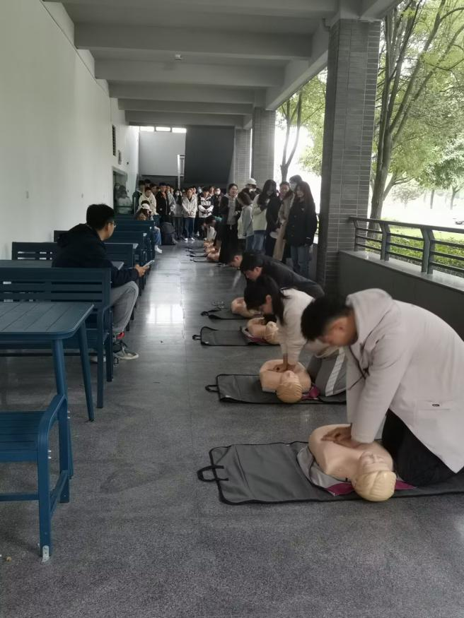 下午13点至17点,红十字会老师讲解应对气道异物梗阻的处理办法。通过列举几个生活中实际发生的案例,向同学们展示了气道异物梗阻的危险性,以及在这种情况下如何进行应急处理。接下来,红会老师讲述了生活中引起心搏骤停的因素、临场心搏骤停的判别方法、以及心肺复苏的正确操作流程。在理论讲解之后,红会老师借助教具模型为同学们演示了如何正确进行心肺复苏。通过结合理论与实践的学习,同学们渐入佳境,积极与老师配合协助完成示例,并练习心肺复苏操作。