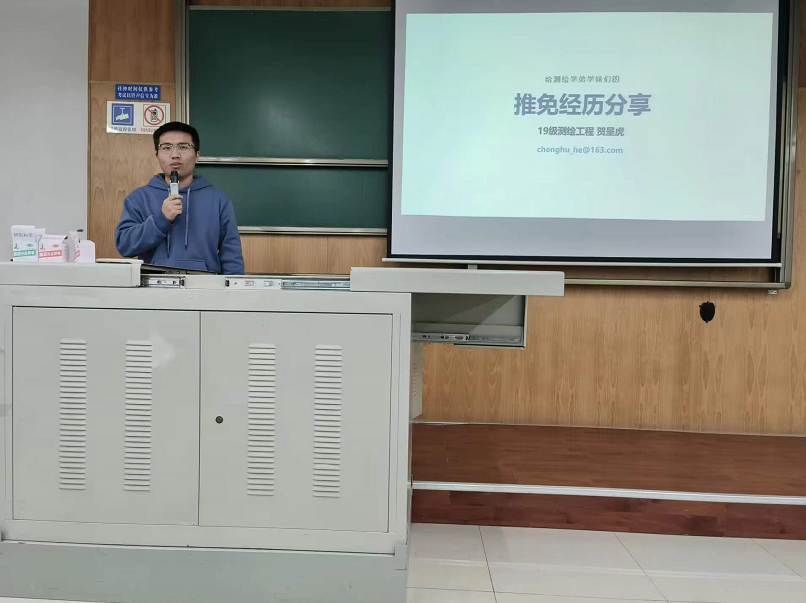 贺呈虎进行了推免经历的分享。从获取信息的渠道、前期的准备、相关夏令营的情况等方面都进行了详细的介绍。贺呈虎强调了及时思考与规划的重要性。他也对一路走来帮助过自己的所有人表达了真挚的感谢。在活动的尾声,6位测绘专业优秀的学长学姐对现场及线上同学们提出的问题作出了详细具体的回答。