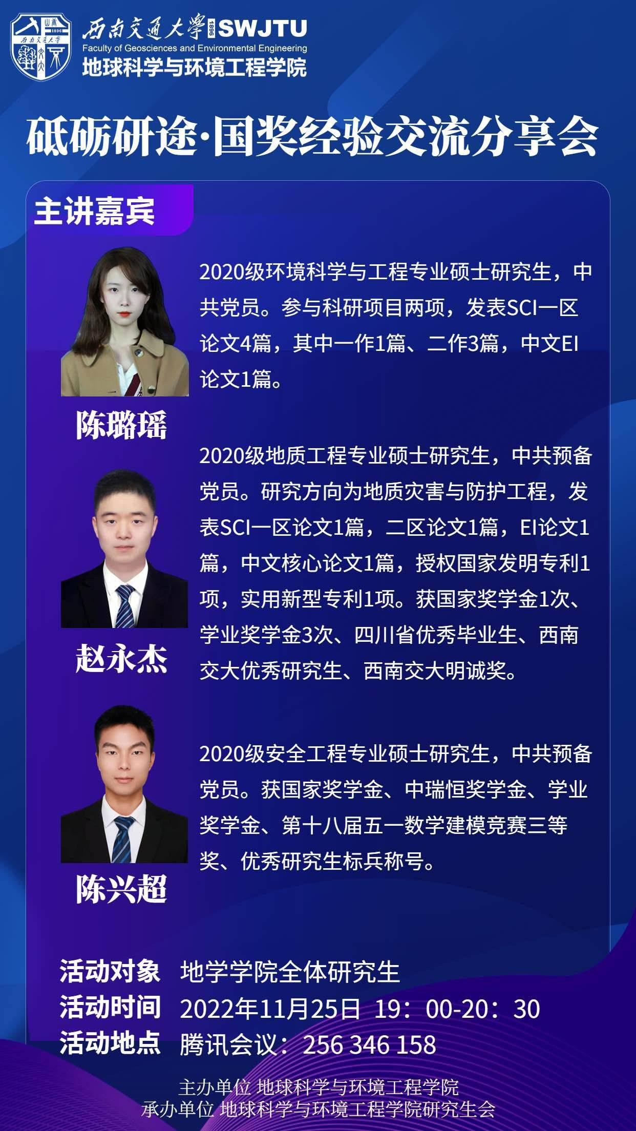 研究生会主办。此次会议邀请2022年我院三位国奖获得者,分别是陈兴超、赵永杰、陈璐瑶,为我院全体研究生分享经验。
