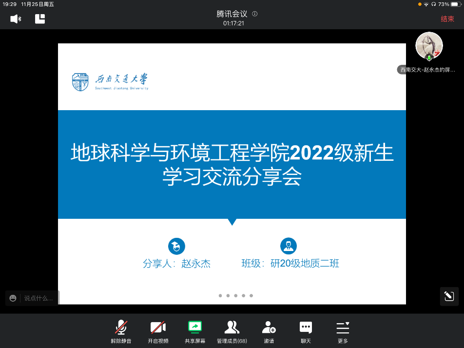 赵永杰,20级地质工程专业,发表SCI一区论文1篇,二区论文1篇,EI论文1篇,中文核心论文1篇,获国家发明专利1项,实用新型专利1项。赵永杰从个人科研经历、学习经验两个方面进行了分享。作为一名研究生,无论今后想读博还是工作,我们都应当提前做好自己人生的规划,根据自己的计划按部就班实现自己的目标。同时,赵永杰还详细分享了论文从撰写到投稿的个人经验总结。