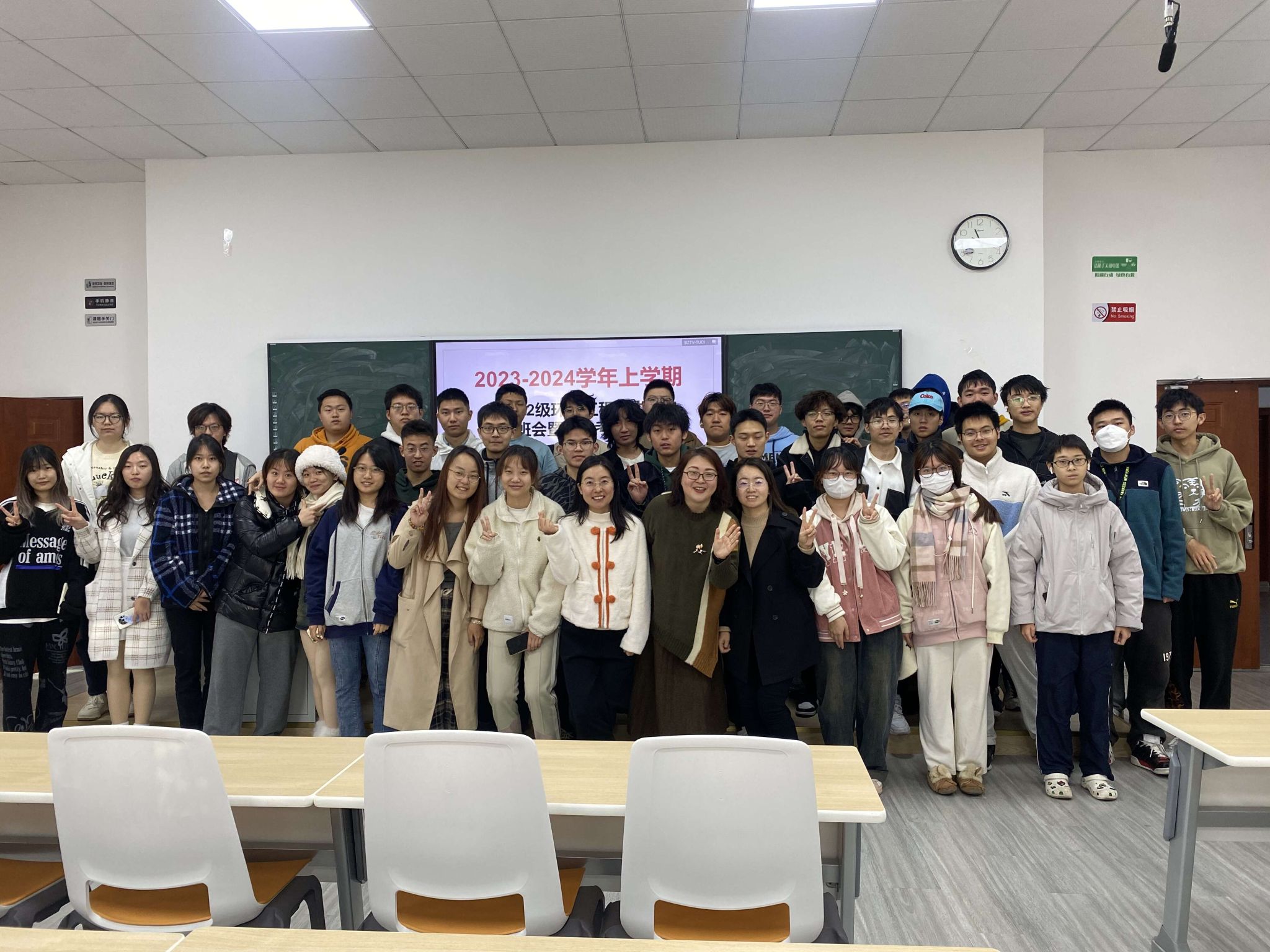 牛小会老师对期中考试情况进行介绍。翟琦老师对大一学年评奖评优情况以及近期班风学风建设情况进行通报。随后,对各班的班级班风学风情况进行对比介绍,希望各班间可以取长补短相互学习。