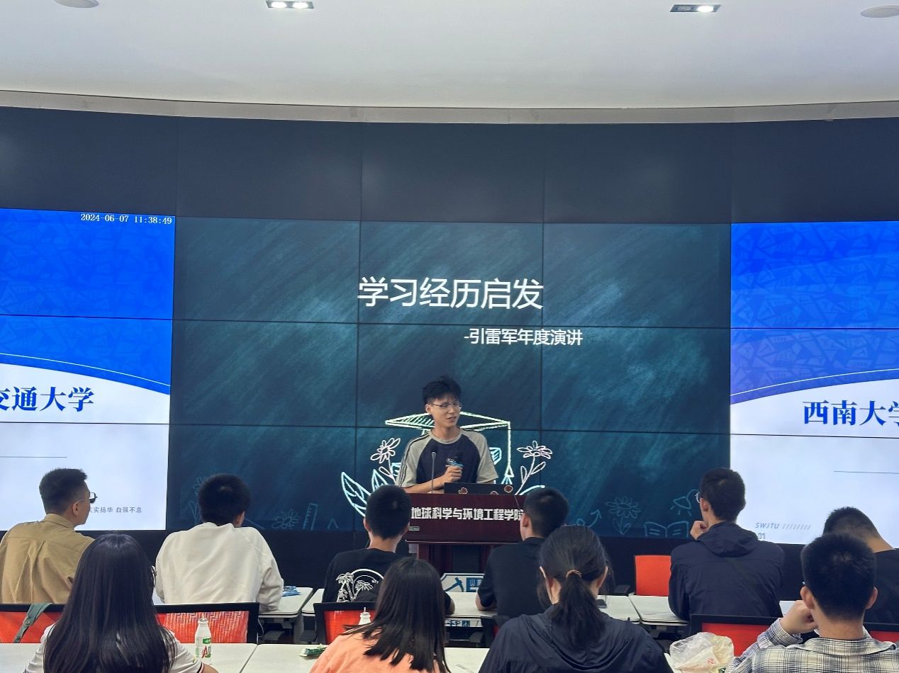 研学之旅最后,学院于X4243教室为西南大学附属中学师生开展优秀学长学习经验交流分享会。学院学生会主席团成员张熙从MBTI人格测试展开此次讲座,为同学们剖析了“兴趣与爱好”,强调了“让兴趣充斥职业生涯,让爱好装饰平淡生活”的理念。随后,本21级测绘工程专业优秀学生庞一帆、本21级遥感科学技术专业优秀学生李子涵、本21级机械设计制造及自动化专业优秀学生许海军依次发言,分别就高中学习技巧、大学学习方法、大学生活等方面同在场同学展开交流。