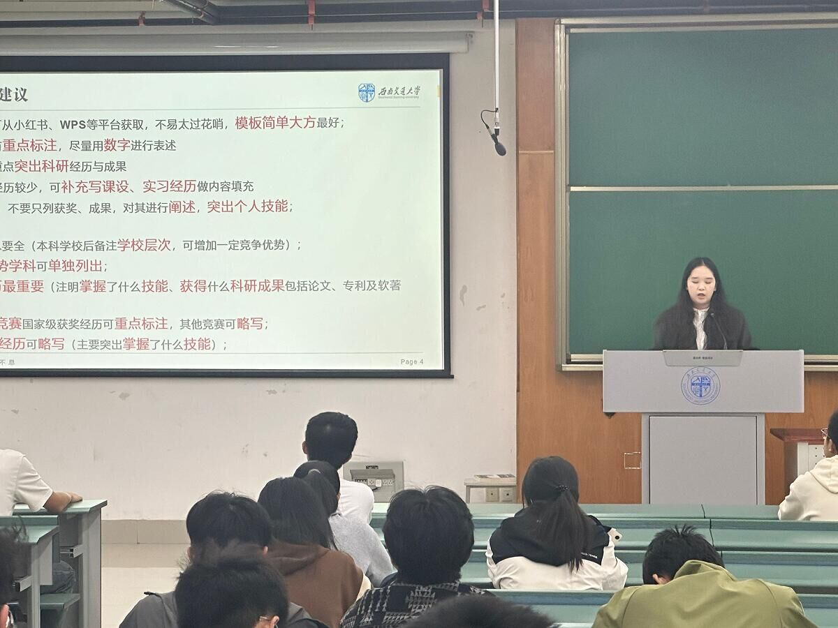首先,徐嘉茜同学以自身保研经历为引子,重点讲述了针对推免的学业规划事宜。关于推免准备的时间线,她提到简历是保研过程中的敲门砖,很多同学就是在最基础的简历上栽了跟头。每年的简历投递时间在5至6月,故应在五月之前做出一份得体的简历。简历制作必须做到简单大方、重点突出、层次分明。在简历中,除了基本信息外,更要注重展现荣誉优势、学科成绩和科研经历。特别是科研经历,应详细注明掌握的技能、获得的科研成果,如论文、专利及软件著作权等。此外,A类竞赛和其他重要竞赛获奖经历也是简历中的亮点。随后是7月份推免夏令营的准备:徐同学结合自身经验,提出“科研经历与成果在保研中优先度最高”的观点,竞赛获奖最大的优势在于帮助位于保研边缘的同学排名上升,稳定保研名额。如果7月的夏令营或者9月的预推免顺利的话,就到了学生反选学校的环节。她建议大家遵循“先老师后学校”的原则。夏令营可以多报,为自己多留一份机会,但在导师选择上,要根据自身情况综合考量,慎重选择,不要“海投”多位老师。