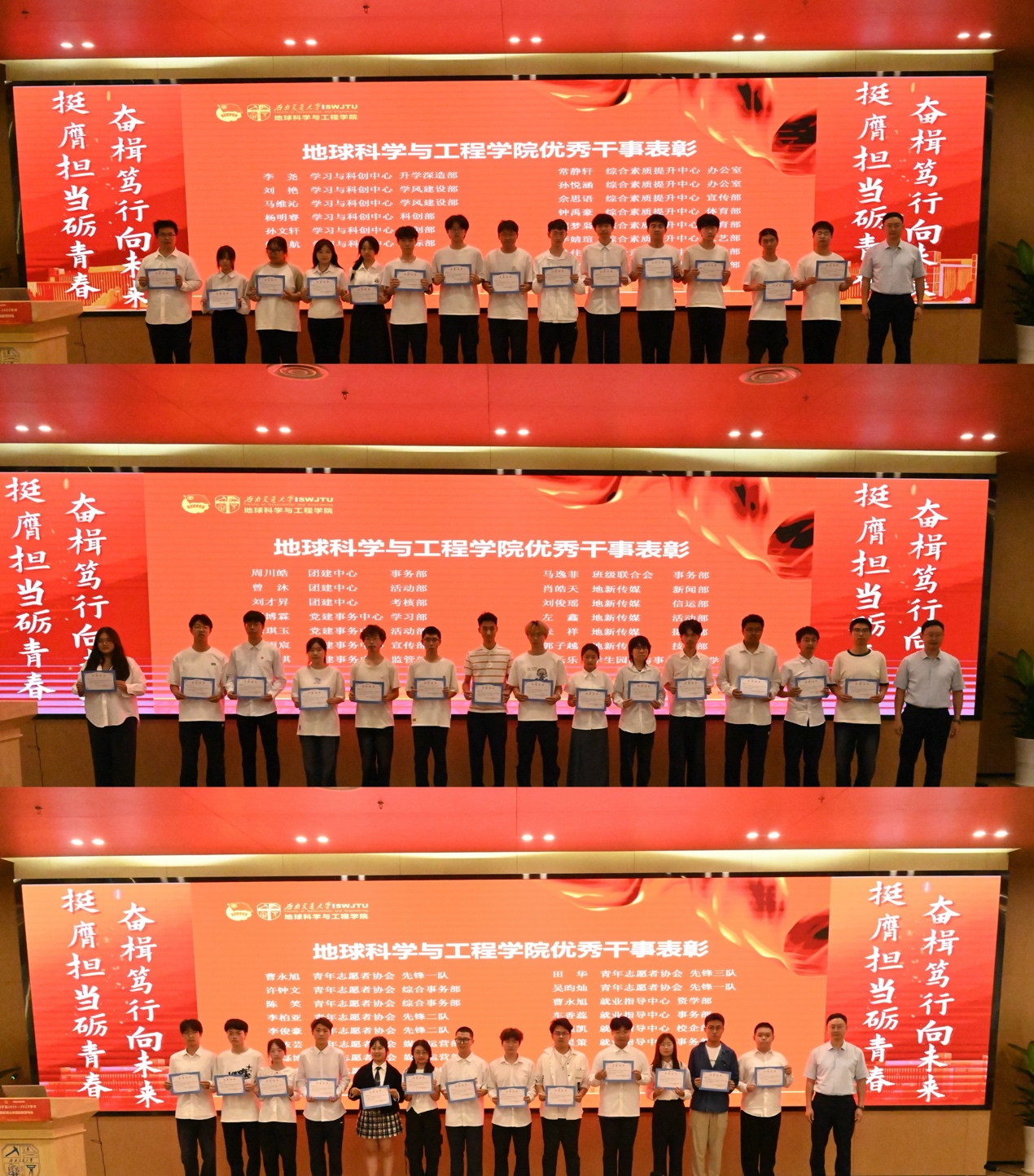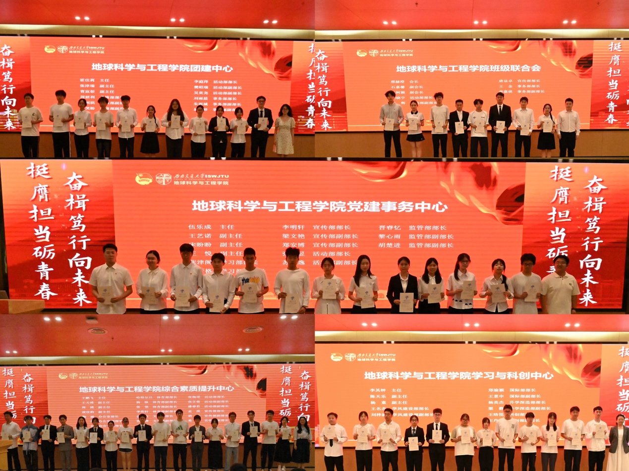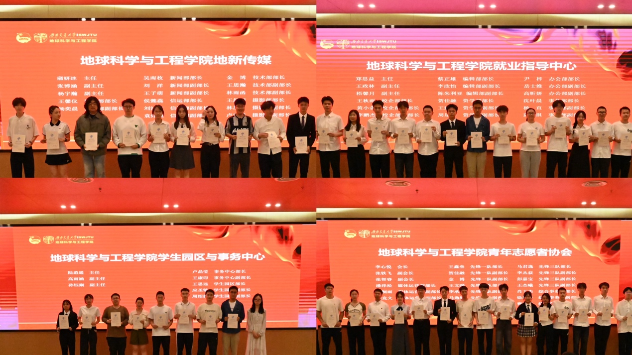 团委书记杨都强老师及各团学组织指导老师为2024-2025学年团学组织学生干部颁发任职证明。这一年来,各团学组织学生干部辛勤付出,用青春年华铸就了坚不可摧的地学力量!