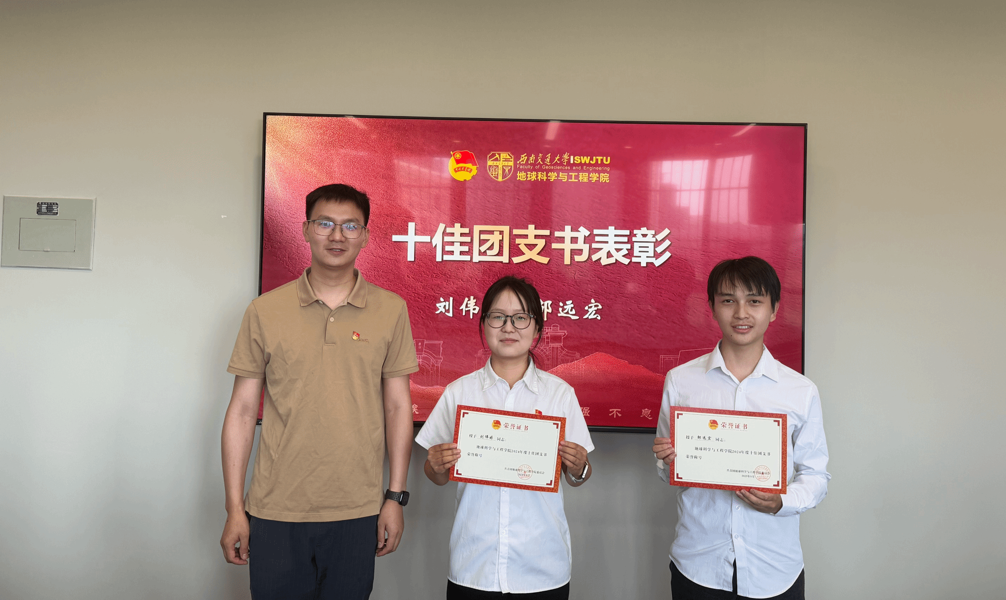 最后进行“十佳团支书”表彰,由杨都强老师为刘伟婷、邹远宏两位同学颁发证书,全场表示热烈祝贺。