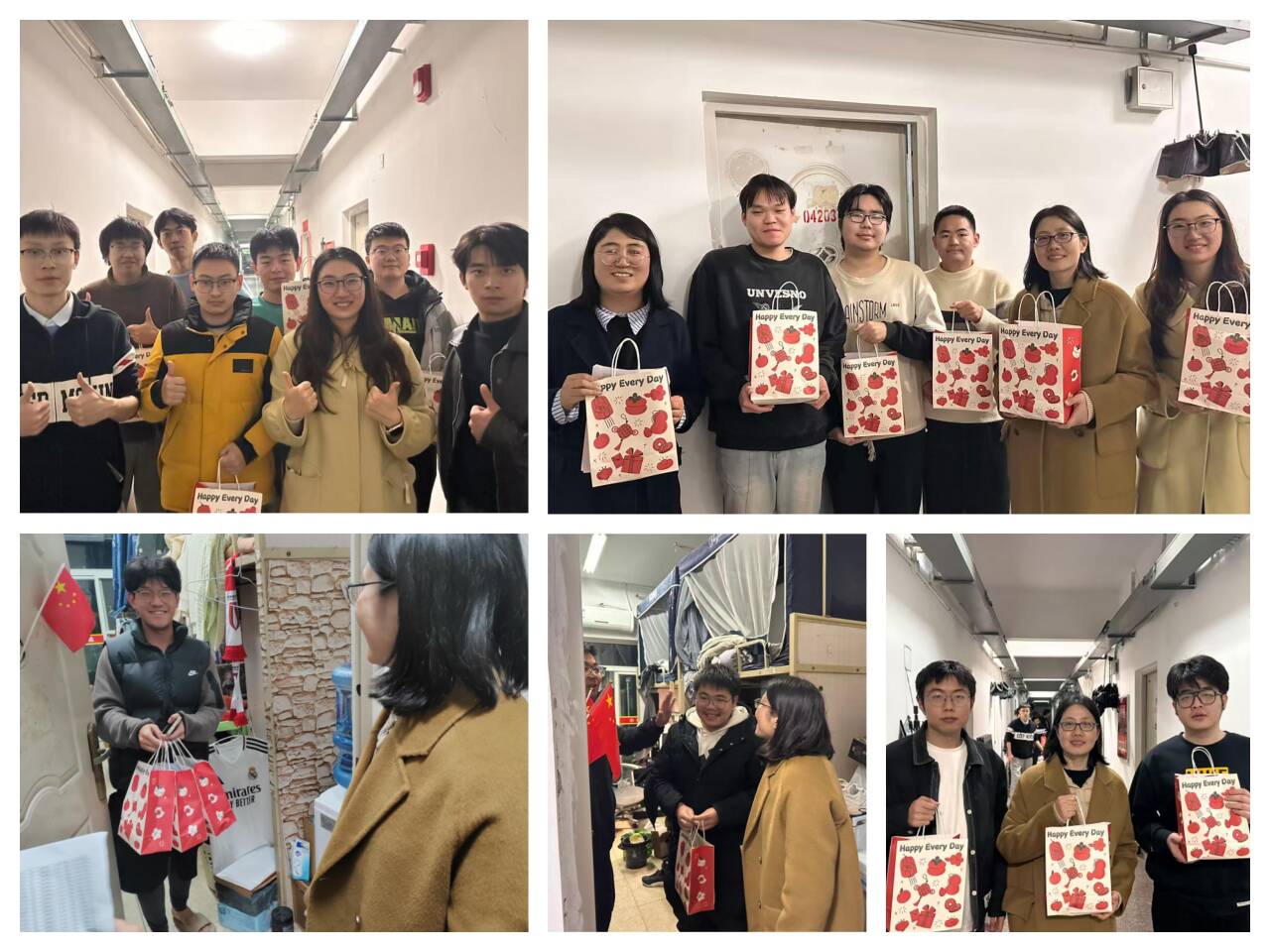 党委副书记曾洁,毕业班辅导员老师孙惠敏、李林遥深入学生宿舍,为学子们送上“考研暖心大礼包”,每一份礼包都承载着学院的贴心关怀。曾洁副书记与同学们分享,考研不仅是知识的比拼,更是意志的考验,希望学子们能够坚定信念、沉着应战,充分发挥自身水平,在考场上书写精彩答卷!