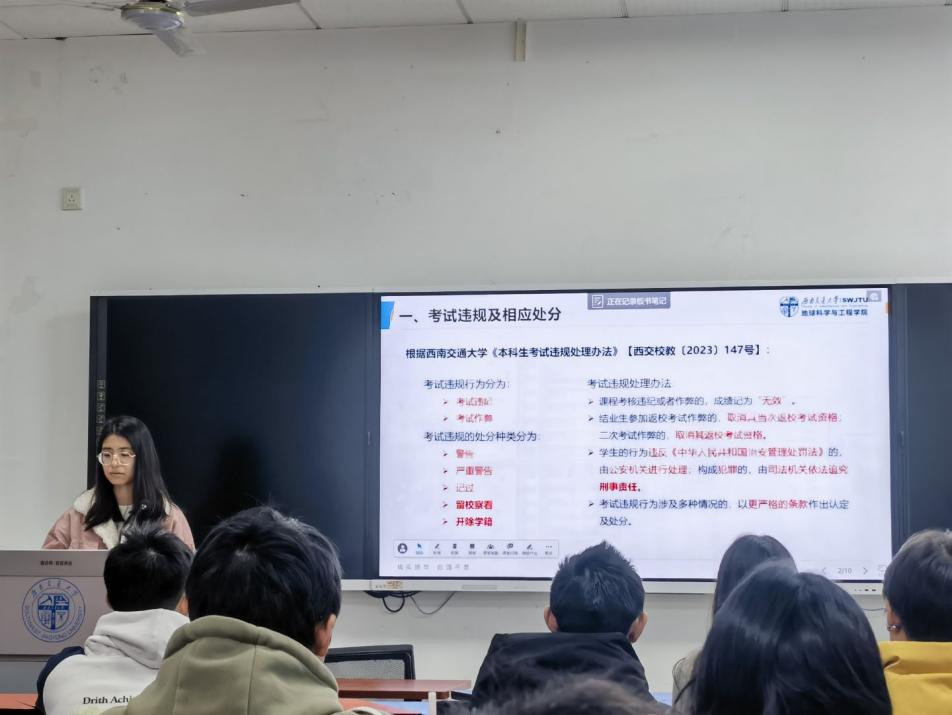 24级地信二班以“诚信应考守底线,反诈防骗护平安”为主题,于犀浦校区X4132开展专题班会。本次班会特邀辅导员王婧雯老师,22级优秀学生代表石嘉馨、班级同学共同参加。