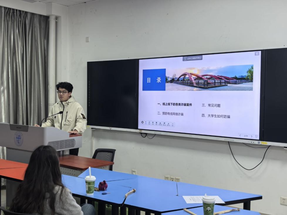 班长吴言齐聚焦防范电信网络诈骗主题,结合反洗钱相关法律法规与典型案例,开展了系统宣讲与深度解读。他全面梳理了校园高发的电信网络诈骗类型,揭露了多种典型诈骗逻辑。