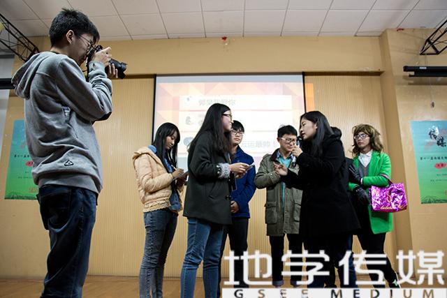 团队风采展示,在人文、交运和生命学院之后,地学传媒登场亮相,伴随着一同播放的视频,主讲人将地学传媒一路走来的故事向观众娓娓道来,并表达了全体成员们的心声,“地学传媒,精彩相随。”