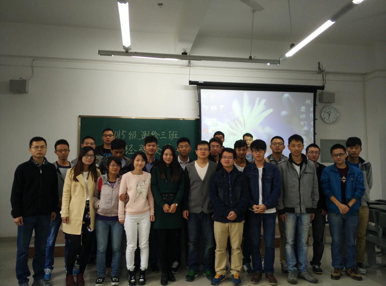 2015年10月日上午9:00——11:00,由地球科学与环境工程学院测绘工程三班举办的以“传经授道,携手并进”的学习经验交流会顺利举行,参加人员有研一学生和四位各方面表现优异的学长给我们分享他们在对研究生学习和生活多方面建设性的建议和经验,四位学长分别是博士二年级的谭诗腾学长(导师:徐柱,是第六届博士研究生拔尖创新人才培养对象)、博士二年级的李政学长(导师:李永树,获得过国家奖学金)、研二的刘锟铭学长(导师:李永树,获得学业奖学金一等奖,研一发表了一篇中文文章)和研二的洪安东学长(导师:黄泽纯,目前担任本科生助教)。本次经验交流会主要面向研一新生,目的在于在使研一新生更快、更好的完成由本科生到研究生的角色的转变,迅速的融入到研究生队伍中。