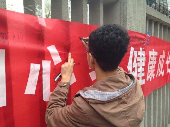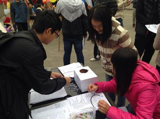 活动开始前,团支书将具体工作分配到各个同学手上,每位同学也都尽力做好自己的工作。十二时,活动正式开始,同学们被分为五组,其中两组同学在来往的人群中发传单,其余同学则坚守大本营,为到来的同学努力讲解并组织其有奖答题。到来的同学首先从箱子里抽取问题,回答正确的则得到小礼品,然后,再在横幅上签字。