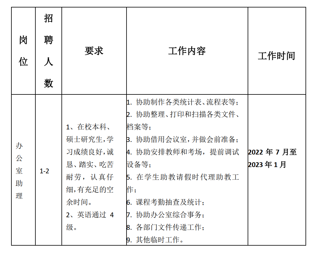 为给学生提供更多的社会实践机会,协助项目办公室做好相关工作,提高办事效率,现面向全校学生招聘办公室助理,工作时间2022年7月至2023年1月,具体通知如下: