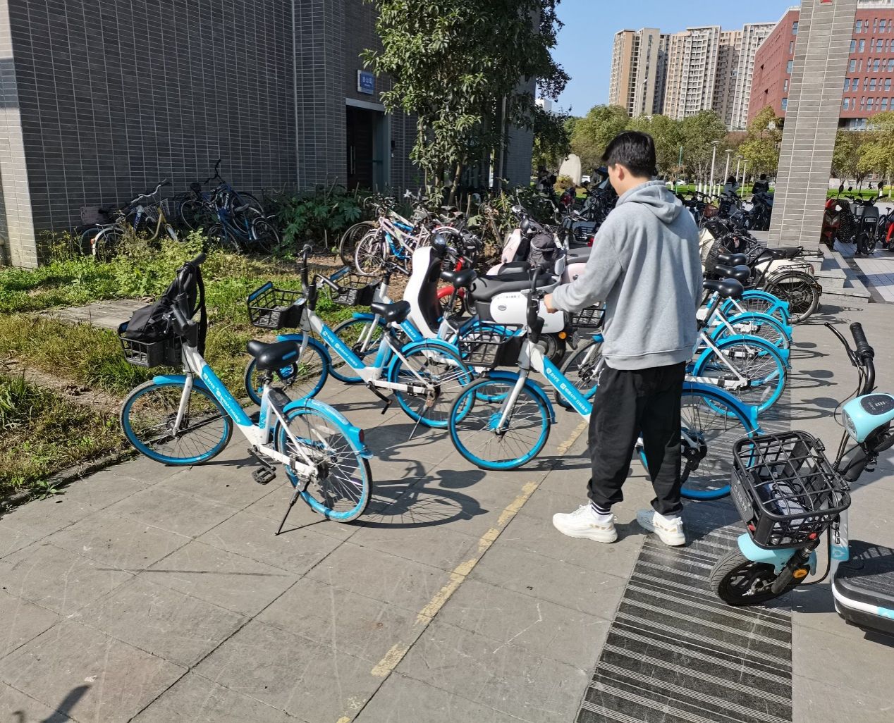 青年志愿者协会定期组织志愿者进行自行车规范停放活动,对乱停乱放单车进行规范停放,向来往同学宣传“文明共享,绿色出行”理念。