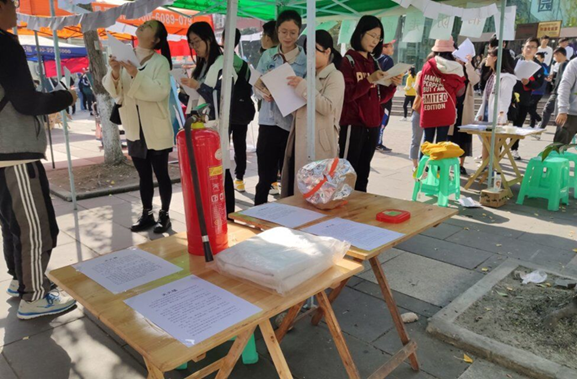 活动当日,志愿者们早早到达各自的岗位上,开始了布置活动场地的工作,为一天的活动做好充足的准备。中午,正是活动高峰期,志愿者们分工明确,各自坚守着自己的岗位,宣传、引导、介绍器材、发放奖品、奖品登记,每一个工作都做得细致到位。同时我们还向消防科老师搬来了“镇场子的宝贝”——二氧化碳灭火器,防毒面具和消防毯。在答题的同时,还能顺便了解消防器材的使用方法,一举两得。这次活动线上线下参与人数达到360人,帮助同学们了解到相应的消防知识,也达到了此次活动普及消防知识,提高学生的安全意识和自救能力,推进实现安全校园、和谐校园的目的。