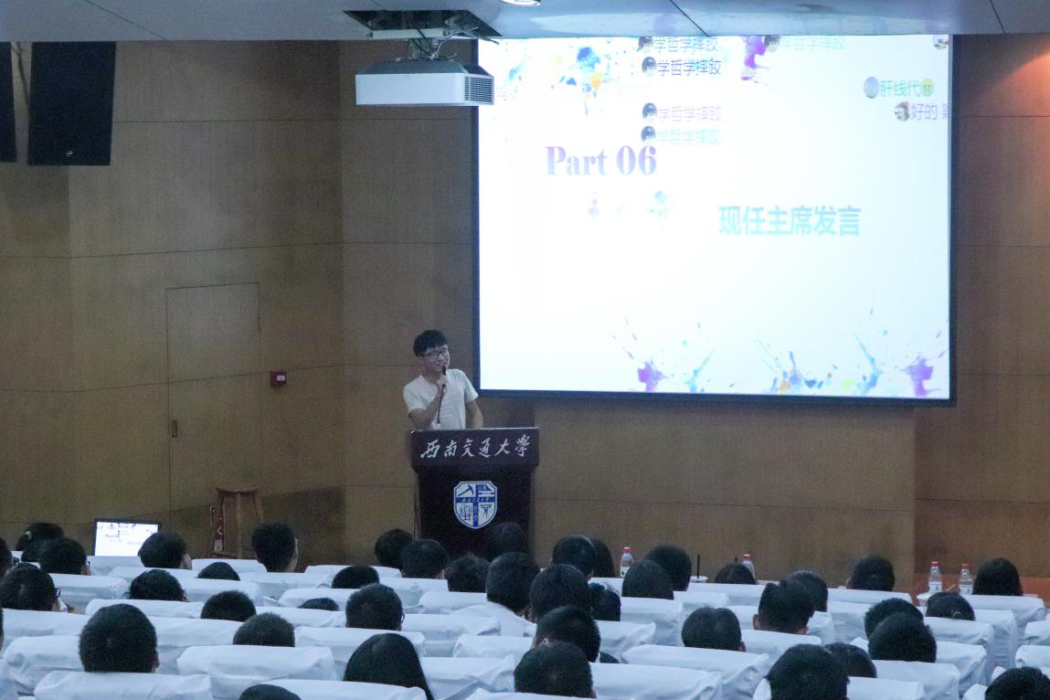 奏唱国歌过后,便是嘉宾发言环节。学生会指导老师-李国欣老师、前任学生会主席-郝建龙主席、现任学生会主席-高颖主席分别上台,并表示自己对这届学生会全体成员充满了信心,希望学生会的每一位成员不仅能在学生会里面学到能力,还能处理好工作与学习之间的关系,不要让自己留下遗憾。李国欣老师提到了在大学要始终保持“三心”:用心、热心、崭新。我们要用心地完成自己手边的每一件事,在待人处事时要时刻保持热心,永远要以一个崭新的面貌面对未来。