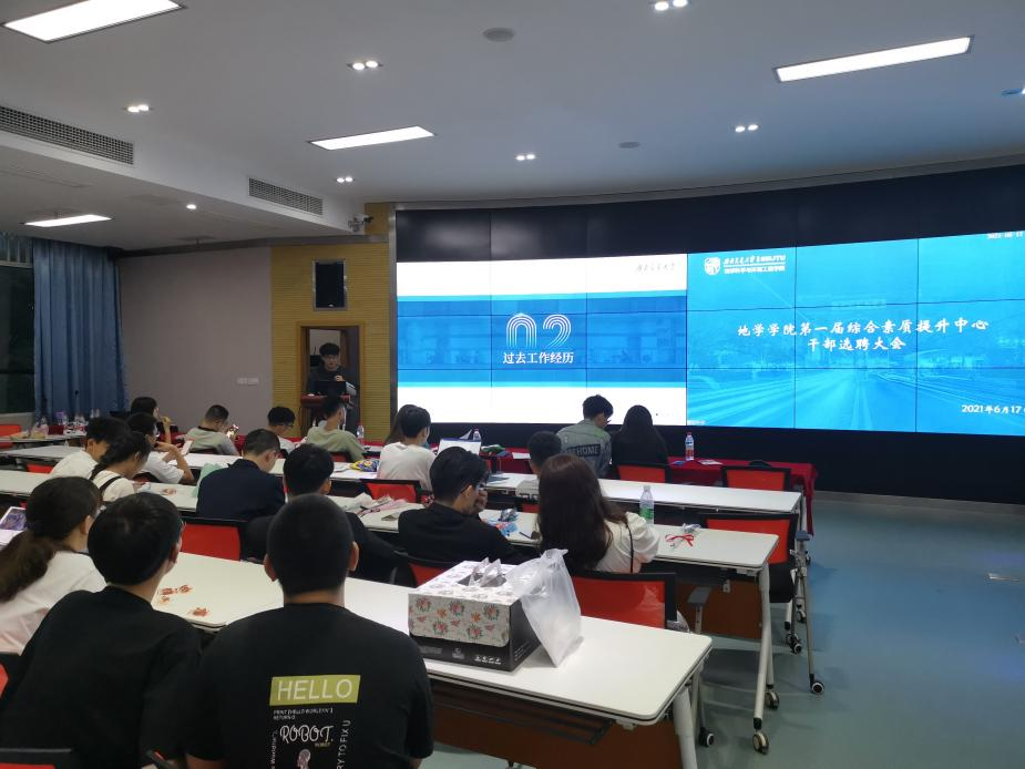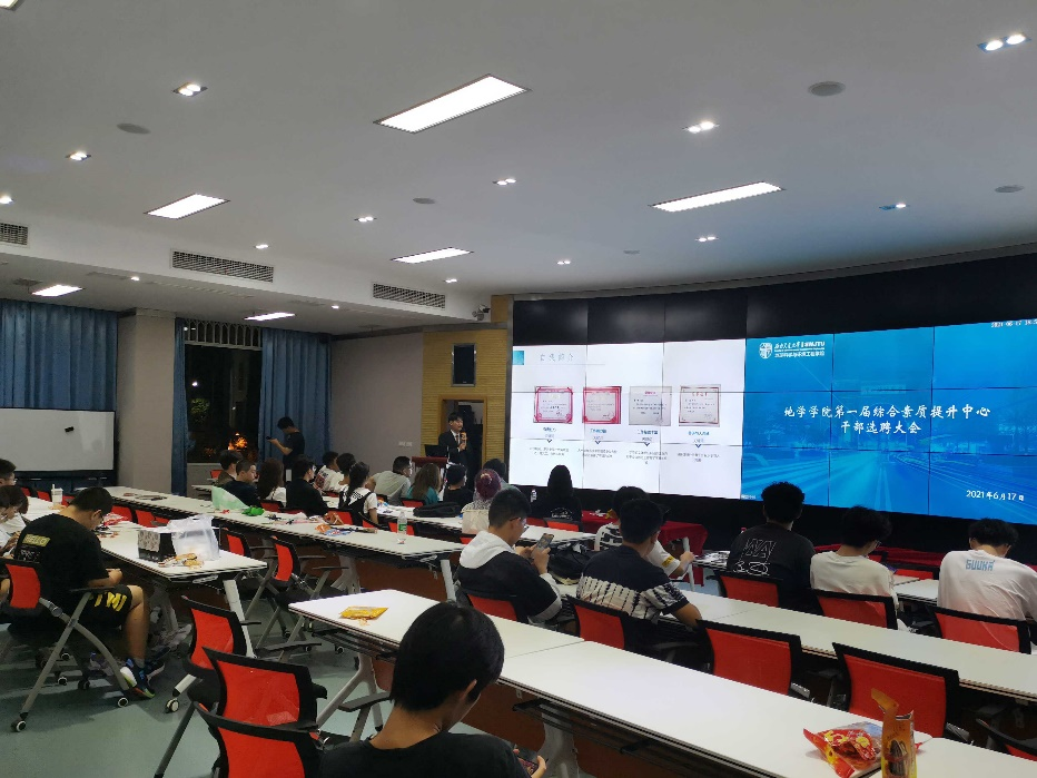 团委书记杨都强老师、学生会指导老师李婧老师、综合素质提升中心指导老师董可老师、学生会主席陈荩娜、综合素质提升中心主席李京伦、马明宇、艾依萍、叶逸辉及原学生会各部门部长在X4243召开本次选聘大会,本次大会为地学学生会改名为综合素质提升中心后的第一次会议,本次选聘答辩共有20位候选人参与。