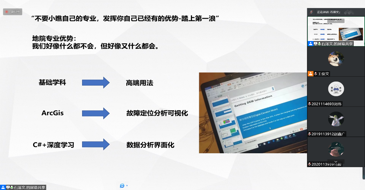 石泽文学长首先通过简要的自我介绍,讲述他在校期间获得的奖项,以此激励大家努力学习。石泽文学长先提出第一点:“踏上第一浪”,不要小瞧自己的专业,发挥自己已有的优势。学长提到,在地院,还存在对自己专业还不满意的同学,对此学长告诉我们,本科期间学什么不重要,重要的是你学到了什么。学长精准地指出了地院专业的特点:我们好像什么都不会,但好像又什么都会。针对于这种令人迷茫的境地,学长提出建议:将自己感兴趣的课程学好,并去探索它的高端用法。
