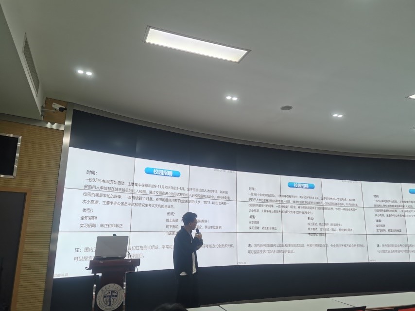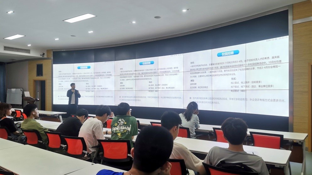 首先,蔡伟健学长以自己的经验总结切入主题,他向同学们讲述了自己的校招经历,列举了一系列的校招小技巧和雷区,干货满满。紧接着,他向同学们介绍了获取就业信息的一般渠道并以华为举例向同学们做详细解释。常言道:授人以鱼不如授人以渔。在如今竞争日益激烈的就业市场上,掌握有效的就业信息获取渠道能大幅降低就业的难度,让同学们赢在起跑线上。
