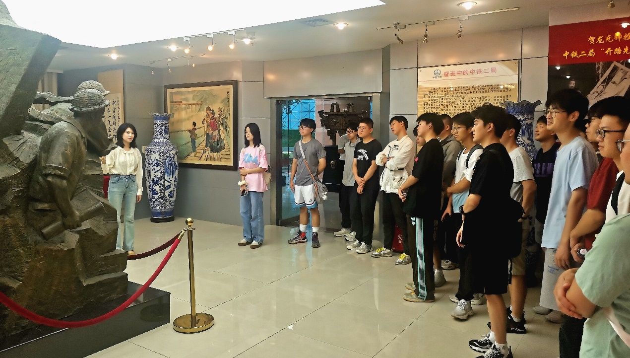 师生乘车前往金牛区通锦路中铁二局陈列馆。在中铁二局团委老师的引导下,同学们共同学习了自新中国第一条铁路——成渝铁路修建以来,中铁二局员工在建设祖国的道路上不畏艰险、追求卓越的辉煌历史,纷纷表示了对中铁二局七十多年以来深耕祖国基础设施建设事业、改善交通民生的钦佩与赞叹。