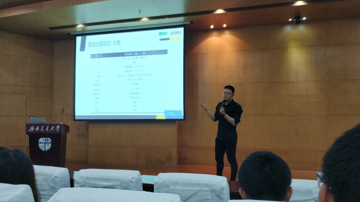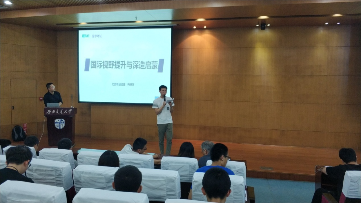 讲座的后半段,是由新东方优秀讲师药思齐老师主讲,药老师介绍到他是新东方留学北美片区的负责人,在讲座中讲到关于出国留学各类事项,从准备到语言考试、到申请以及与教授套磁等诸多内容,过程中干货满满。同学们表示深受启迪。