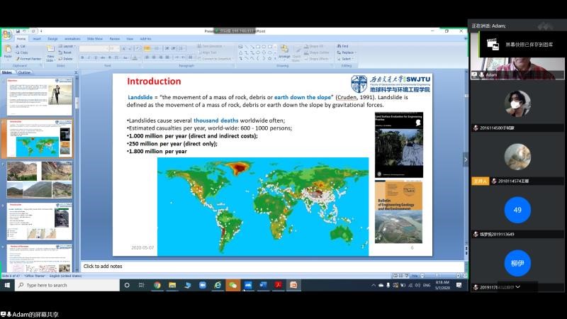2020年5月7日晚20:00,地球科学与环境工程学院邀请学院外籍教师开展“国际化+名师讲堂”国际视野与出国留学系列第三期讲座,本次讲座通过线上平台“腾讯会议”进行,主讲人为Saeid(Adam) Pirasteh教授,讲座由杨都强老师主持,讲座主题为Research Colloquium in Geospatial Information Management for Disaster Management: Landslide(地理空间信息管理促进灾害管理研究讨论会:滑坡)。