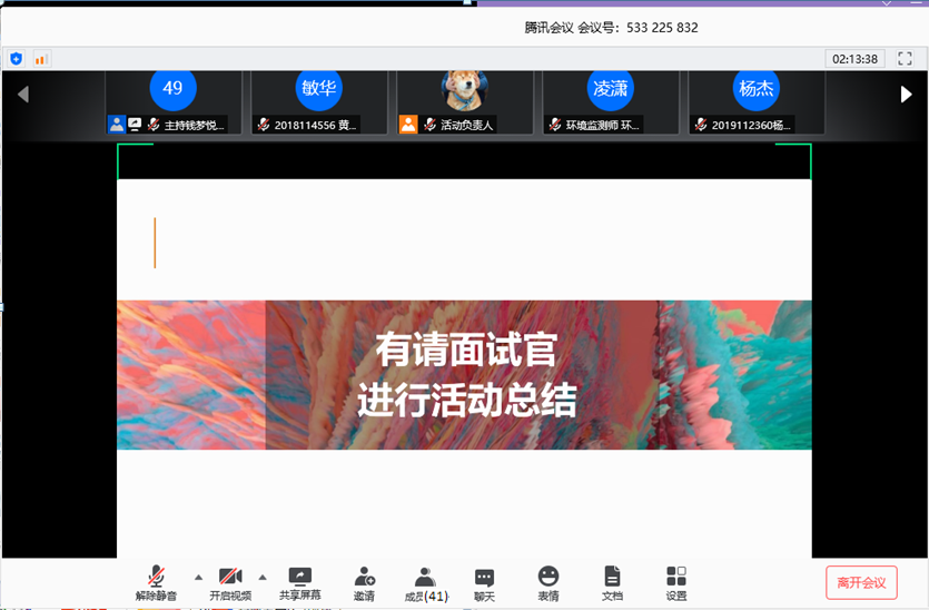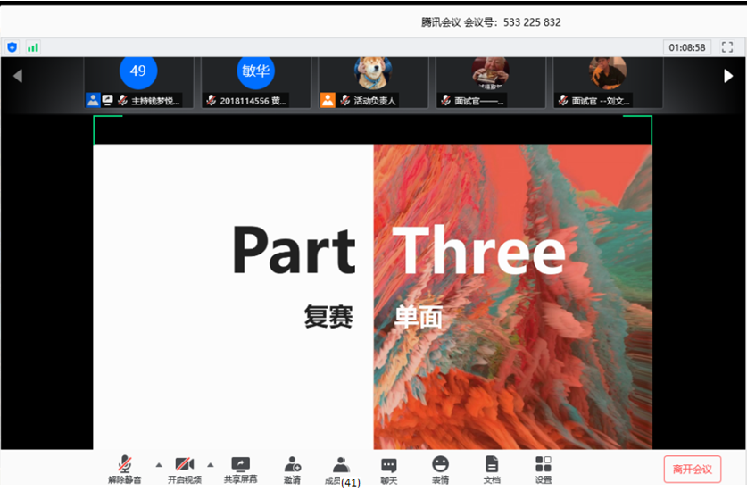 5位同学“单面”完成后,主持人宣布复赛结束,进行成绩统计,面试官对本次活动进行了总结。主持人公布获奖名单,宣布本次活动结束。