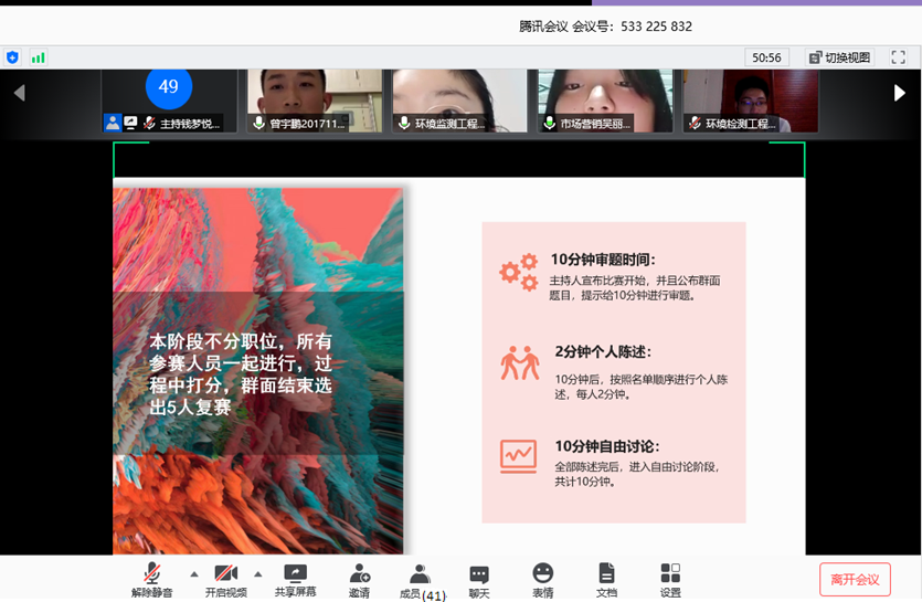 所有选手陈述完毕后,主持人宣布进入10分钟自由讨论阶段,这时选手打开麦克风和摄像头进行讨论。经过讨论,选手们发现大家对题目理解有些许失误,并迅速调整过来,重新对题目进行了思考,最后形成了统一的解决方案。该过程结束,工作人员在QQ群里发放参考答案,并进行选手分数统计,最终选出5位优胜者进入复赛。