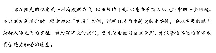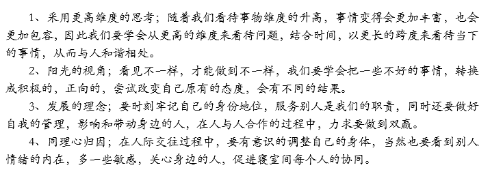 杨老师首先表示发挥寝室成员间的协同作用,其实也离不开人际交往的艺术。老师从上一期谈话的四个方面出发,针对男生这样一个群体,进行了另一番深入的讲解。